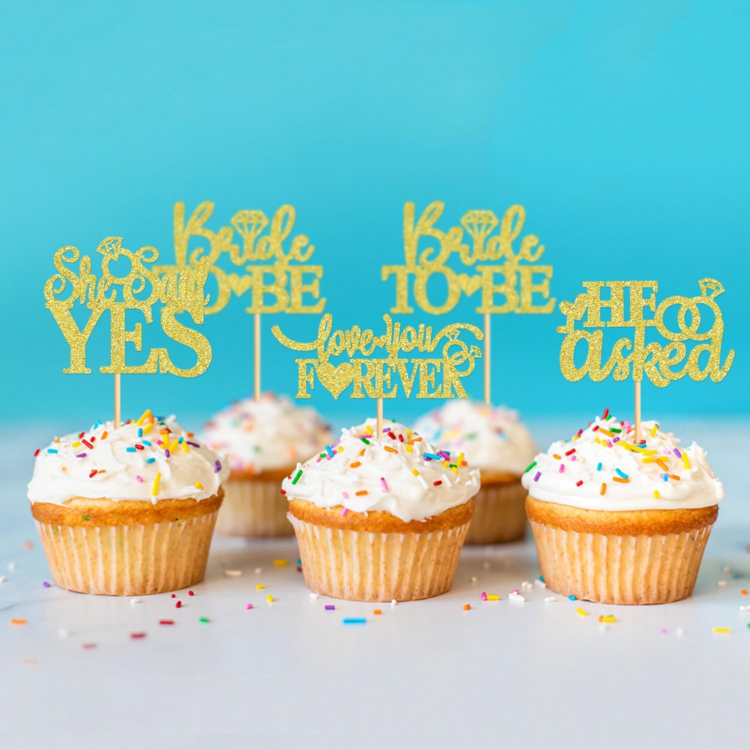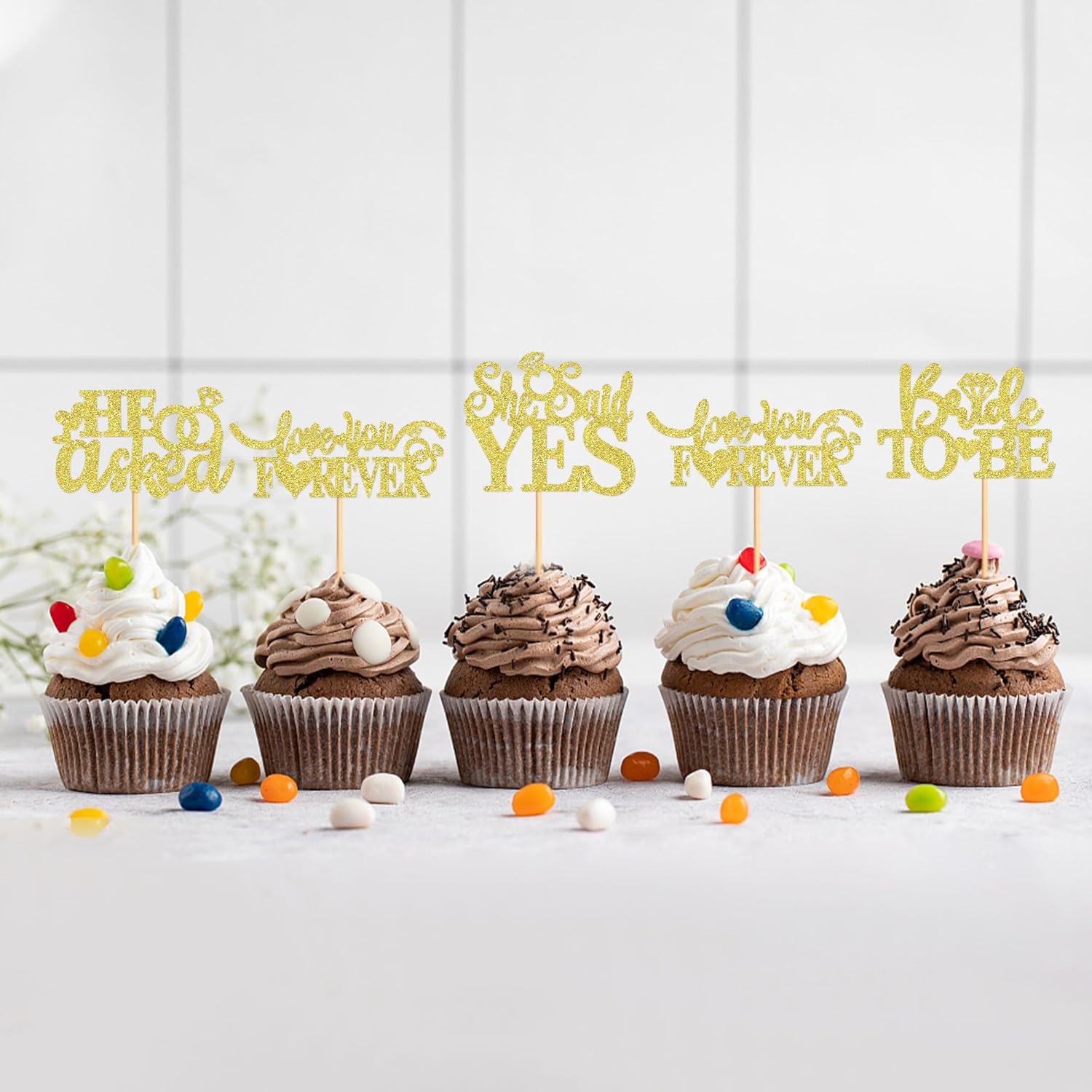 24 Pcs He Asked She Said Yes Cupcake Toppers Cake Picks for Wedding Engagement Party Cake Picks for Wedding Bridal Shower Party Cake Decorations golden