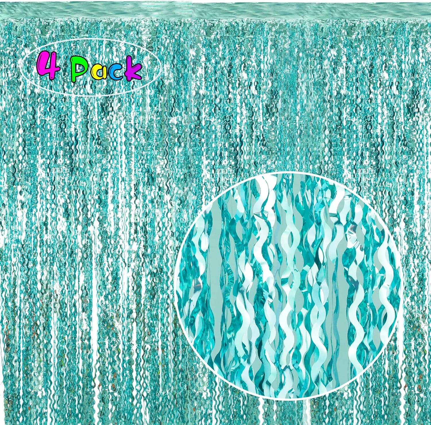 4 Pack 3.3 ft x 6.6 ft Wavy Aqua Teal Blue Tinsel Foil Fringe Curtains Backdrop - Wave Metallic Foil Curtains for Wedding Girl Princess Bachelorette Euphoria Theme Party Decoration
