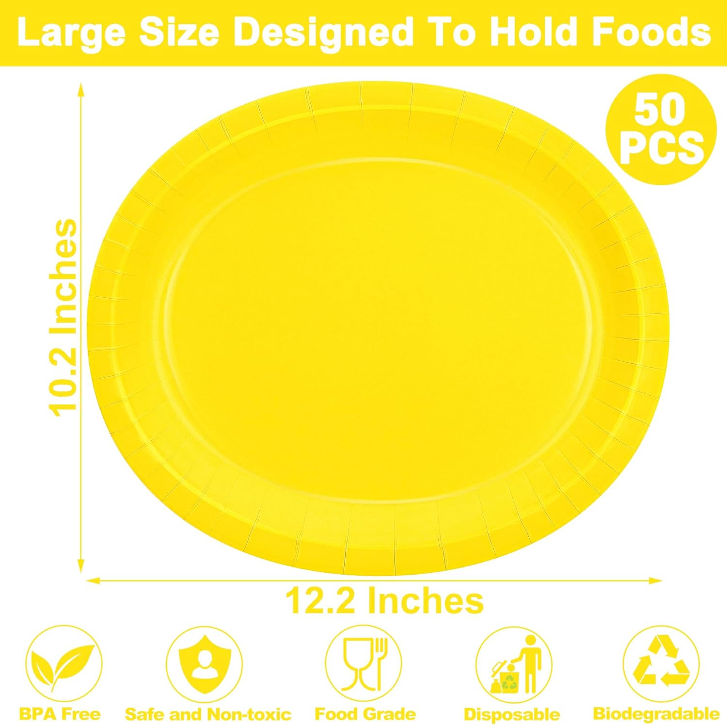 50 Pcs Party Decorations, 12.2'' X 10.2'' Oval Large Paper Plates, Yellow Disposable Paper Plates, Heavy Duty Paper Plates for Birthday Party Wedding Picnic Baby Shower Barbecue Holiday Daily Use
