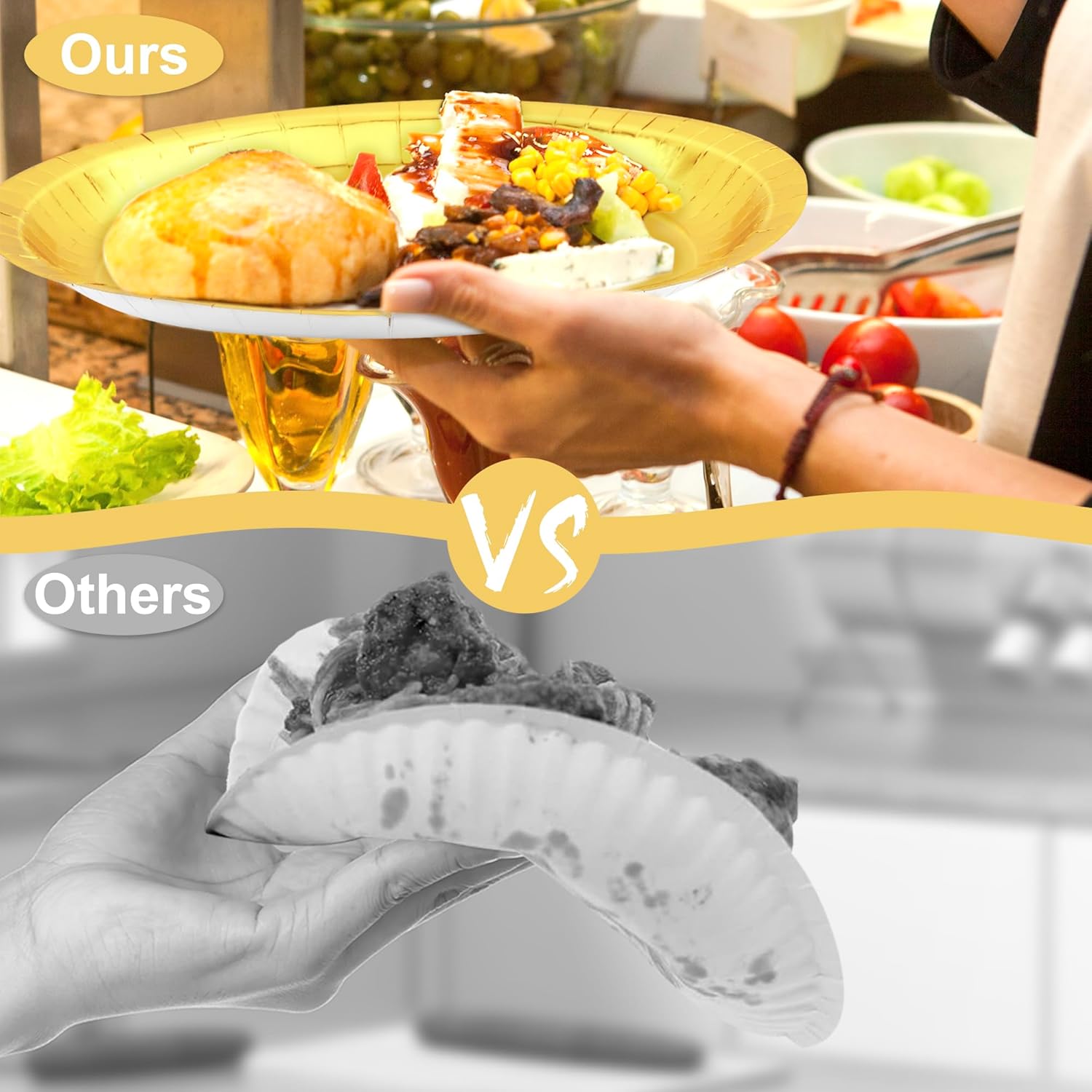 - Reliable Material - Crafted from 350 gsm high-quality thick paper, with gold foil embellished on the surface of the dinner plates, our heavy-duty paper plates provide stable support even for a sumptuous meal, without bending or leaking.