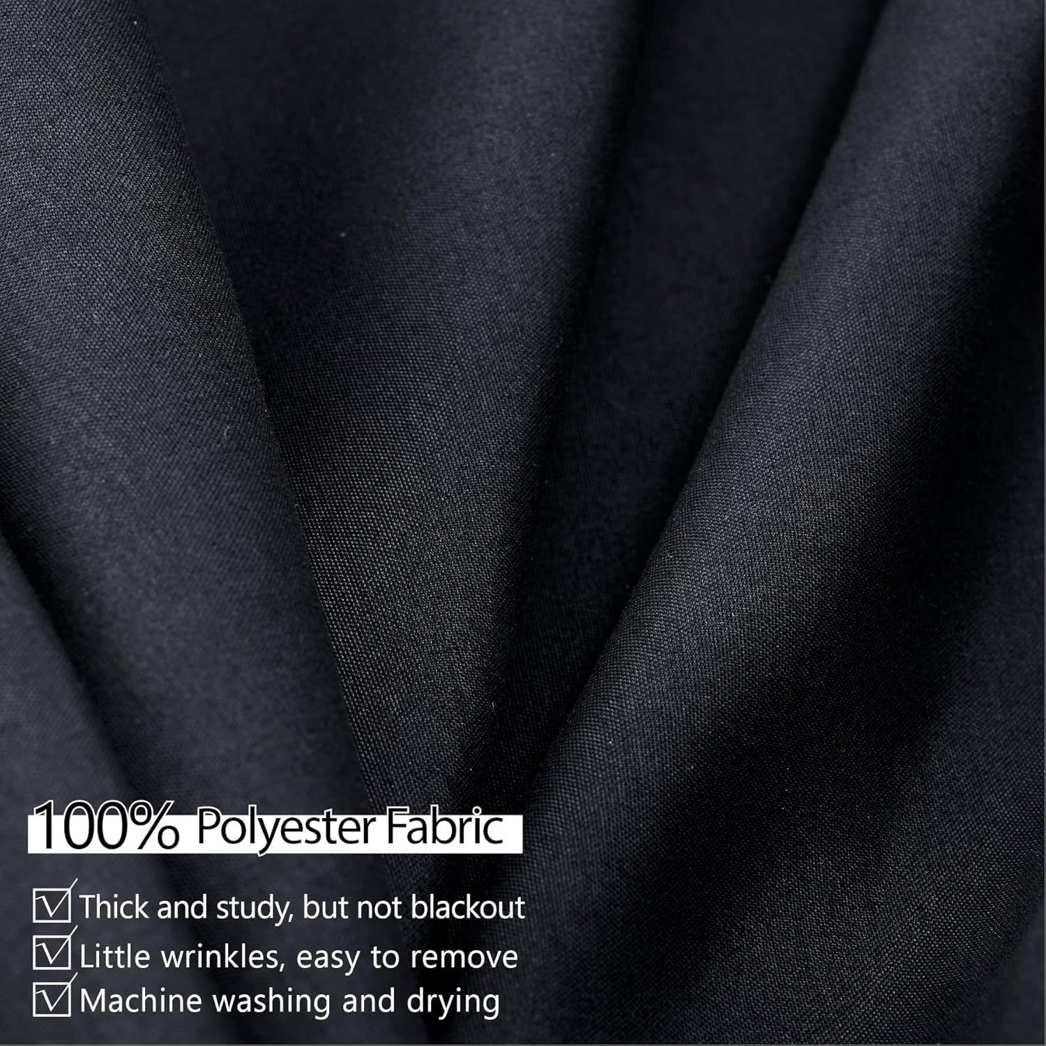- Thick Polyester Fabric - 100% polyester black backdrop curtain,thick and sturdy, but breezy and flowy, not see through, drapes well, Little wrinkles(easy to remove), machine washing and drying, reused over and over again as a party backdrop