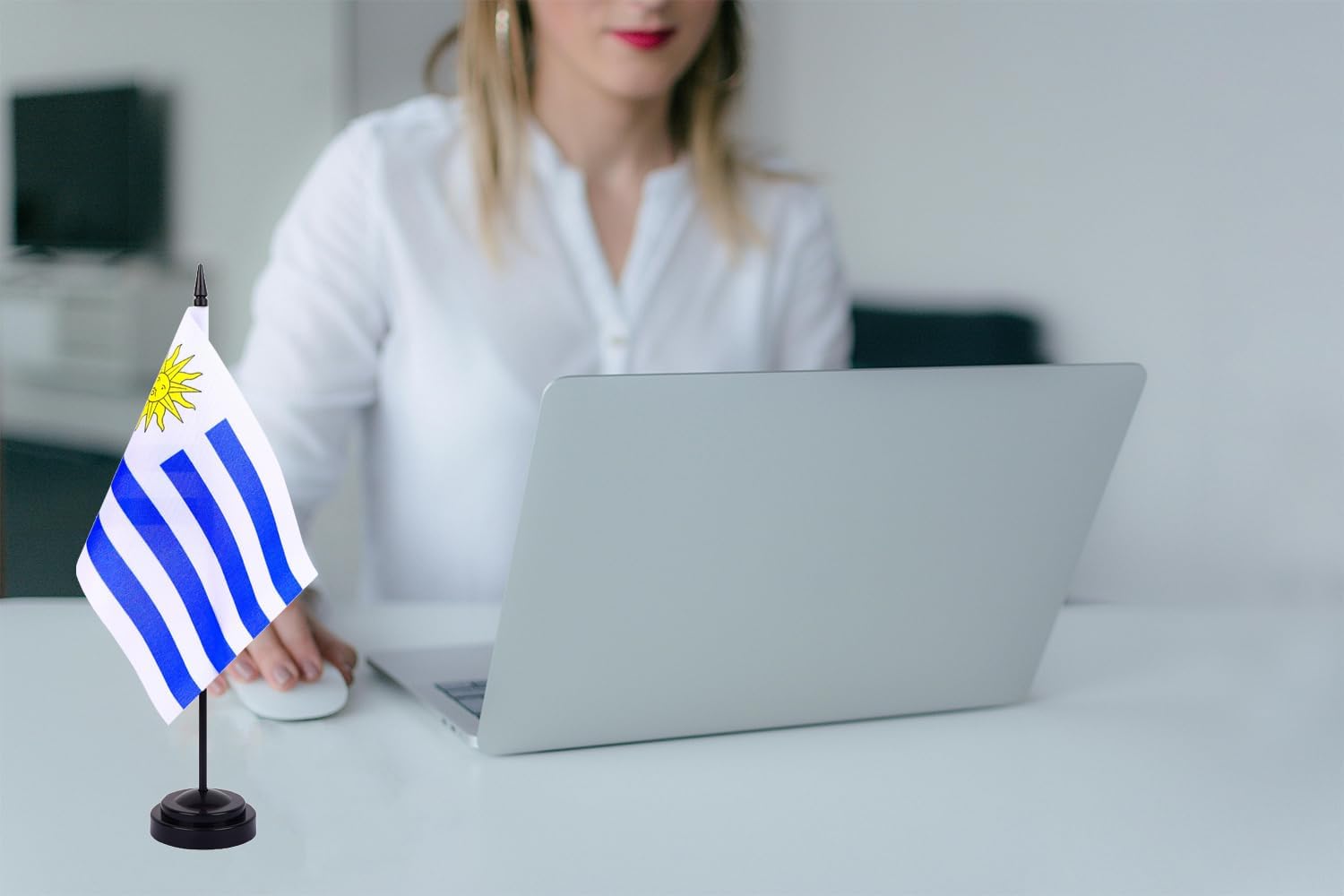WXTWK 2 Pack Uruguay Flag Uruguay Deluxe Desk Flag Set - Mini Small Uruguayan Table Office Flags with Black 12" Solid Pole Stand Base Classroom Meeting Desktop Decorations