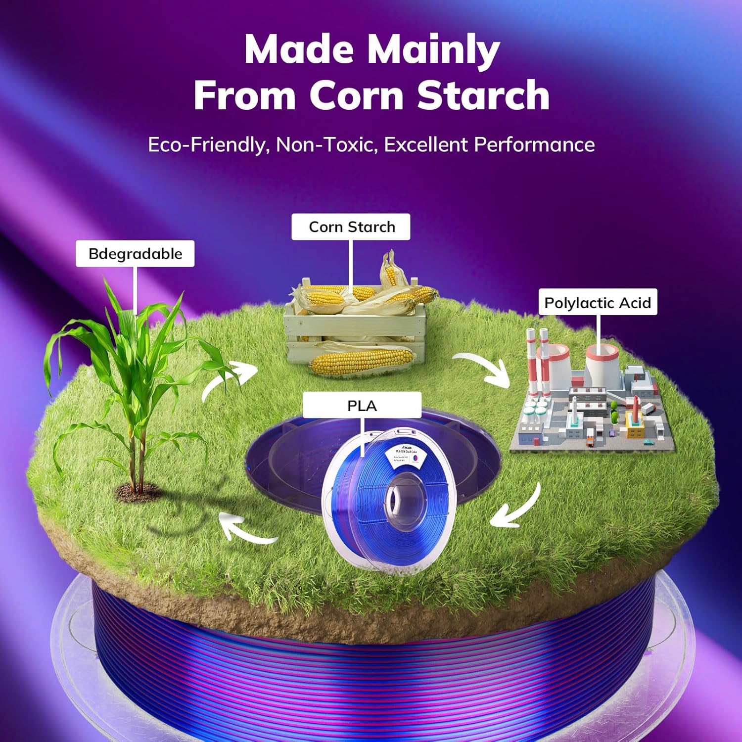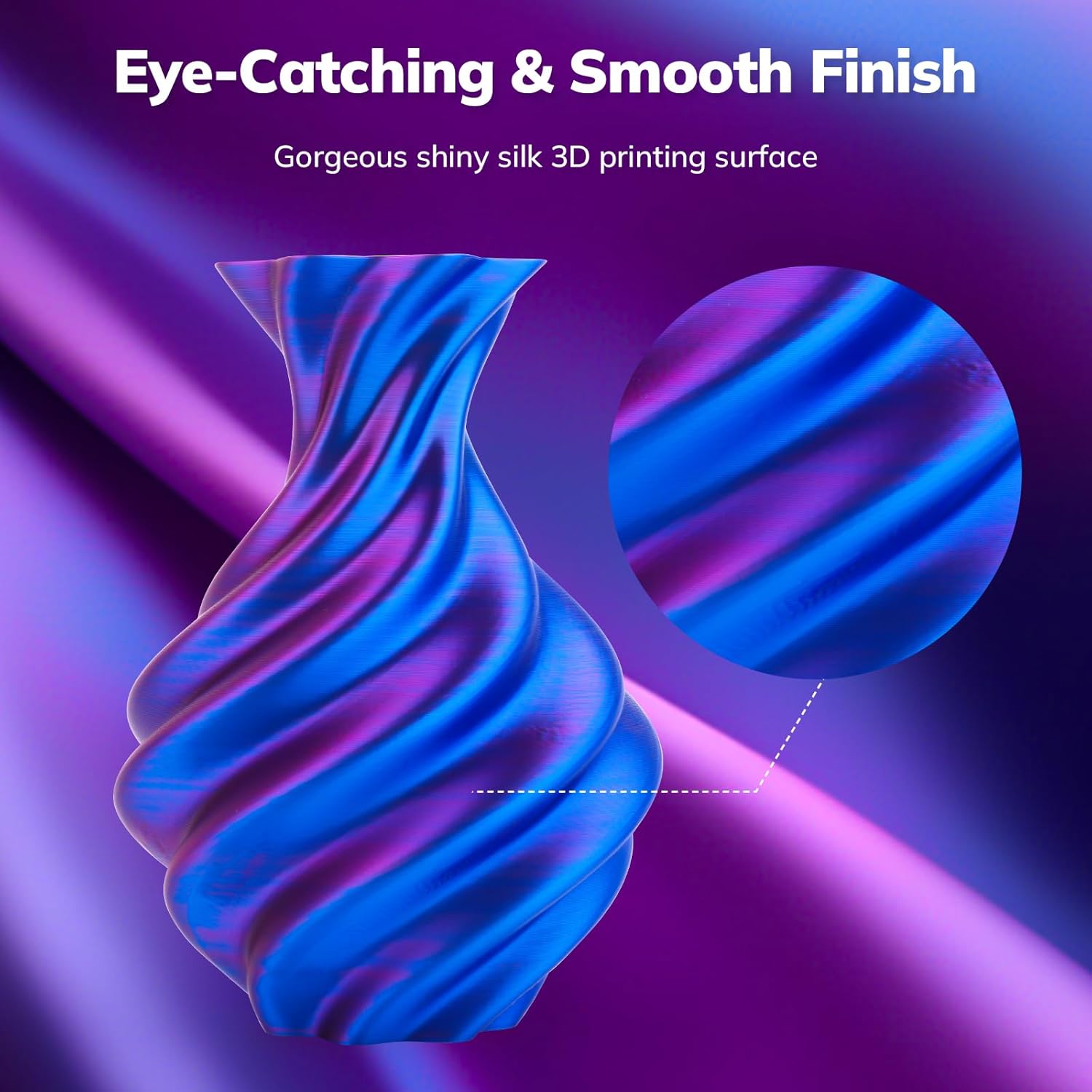 - Eye-catching Silk PLA: Shiny blue and fuchsia combination of magic 1.75mm PLA filament, make the two sides of your print appear in different colors. Without polishing, you can get a silk glossy and smooth 3d prints. Beginner & expert friendly, it’s your go-to for eye-catching designs all year round
