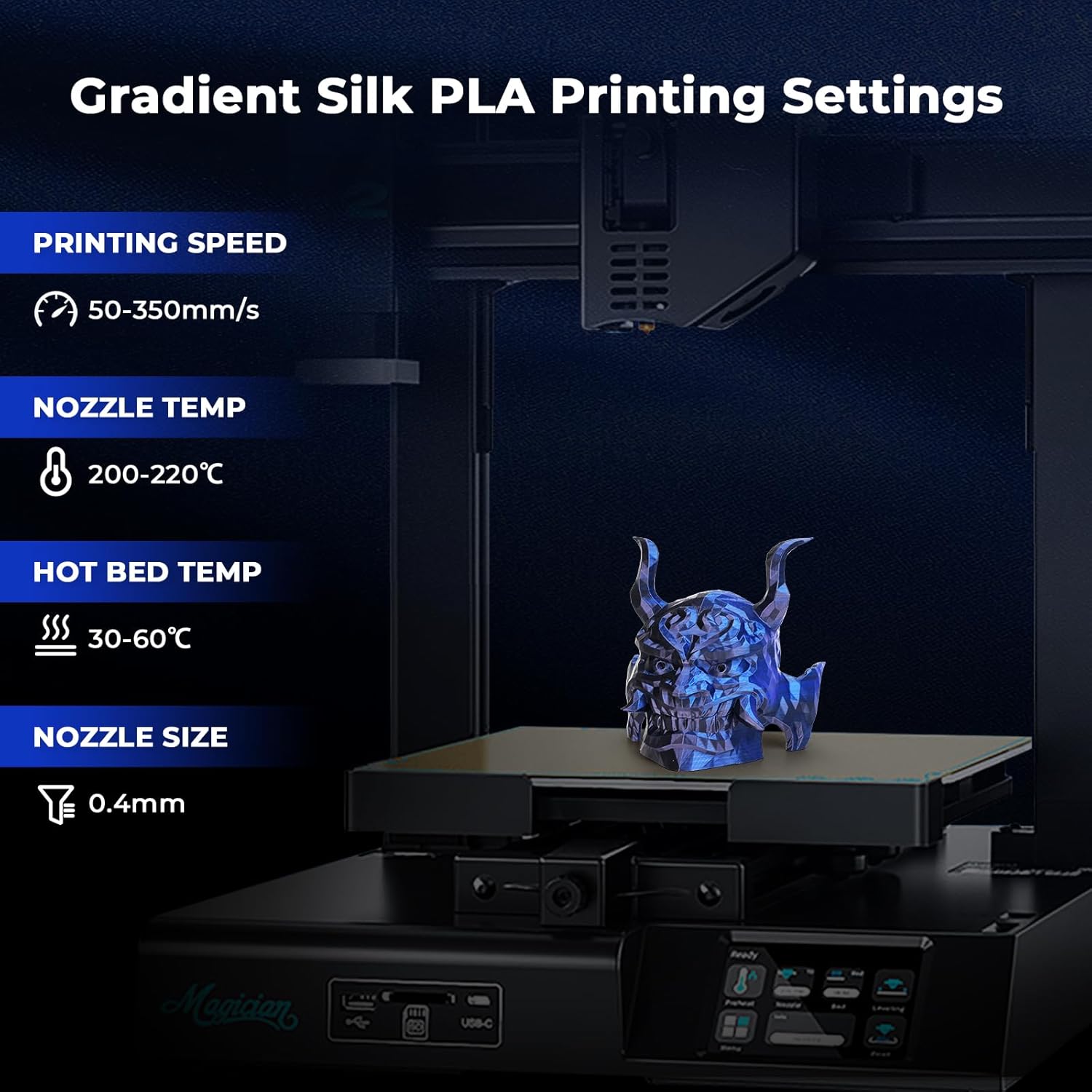 - Eye-catching Silk PLA: Shiny black and blue combination of magic 1.75mm PLA filament, make the two sides of your print appear in different colors. Without polishing, you can get a silk glossy and smooth 3d prints. Beginner & expert friendly, it’s your go-to for eye-catching designs all year round