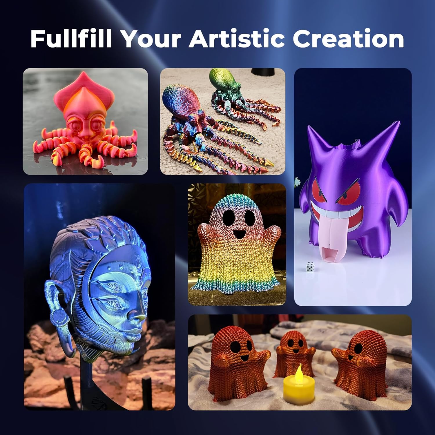 - Silk Dual Color PLA: Experiment with multiple hues without the commitment of larger spools. You can print beautiful multicolors in one PLA filament, perfect for arts, crafts, DIY. Whether you're crafting Easter decorations, designing Halloween costumes, creating Christmas ornaments, or making Valentine’s surprises, this filament delivers stunning results every time