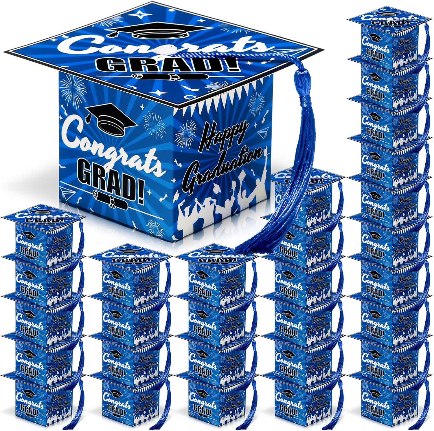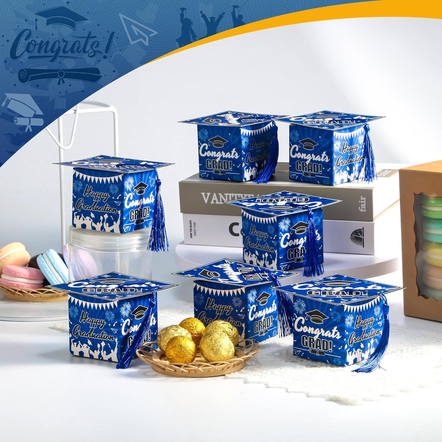 - Size: 2.36*2.36*2.36in. These portable small candy boxes are suitable for presenting a variety of treats such as candies, cookies, chocolates, or small gifts. Designed in the shape of graduation caps, adorned with classic graduation scenes elements, printed with exquisite graduation phrases, these mini gift boxes are ideal graduation party supplies.