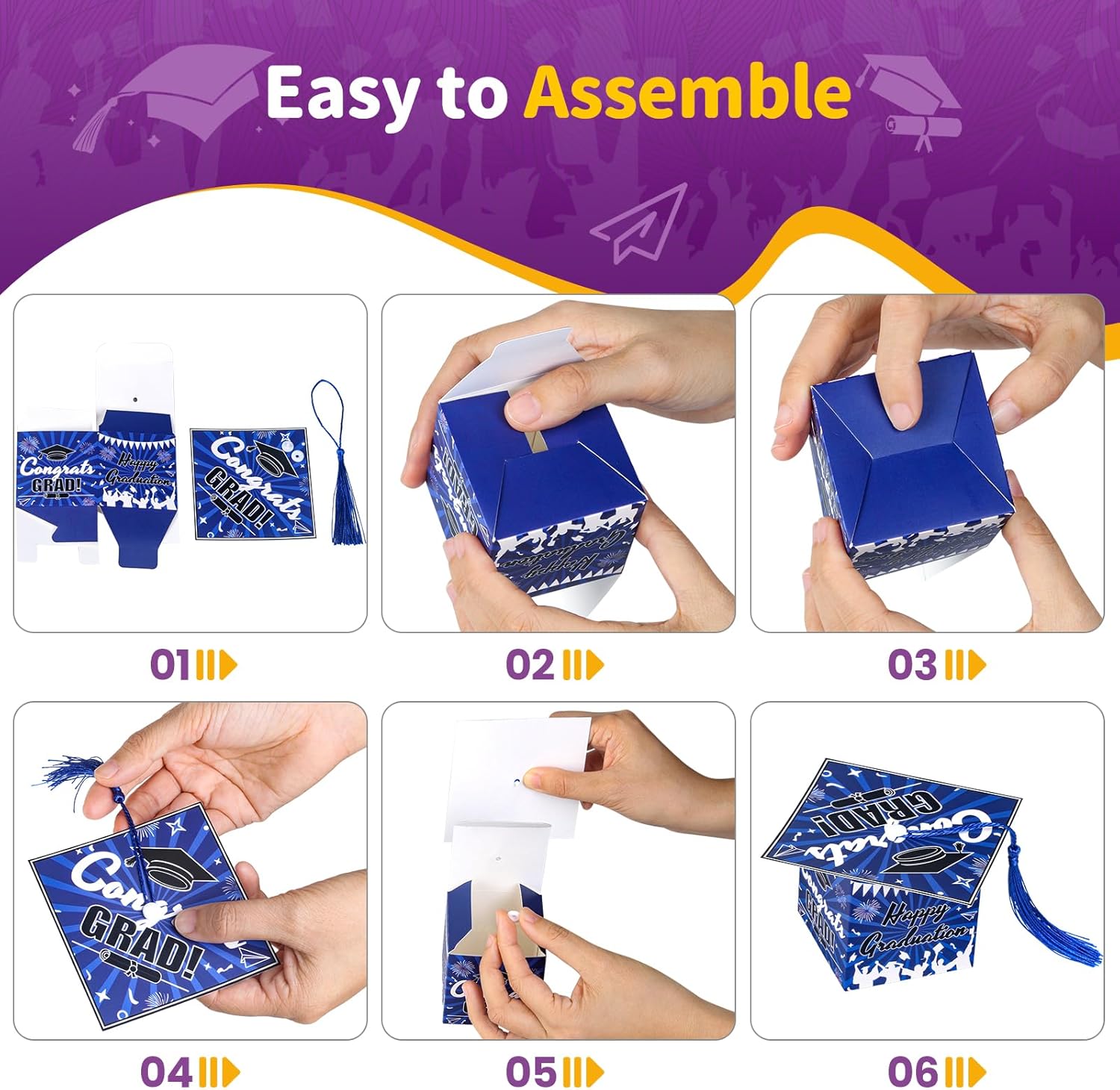 - Easy to Assemble: The graduation treat boxes are flat packed and easy to fold, saving you time and effort during your event preparation. Simply assemble them according to the crease with a few easy steps, fill it with small delectable treats or other small gifts you would like to present, making the gift-giving moment meaningful and memorable.