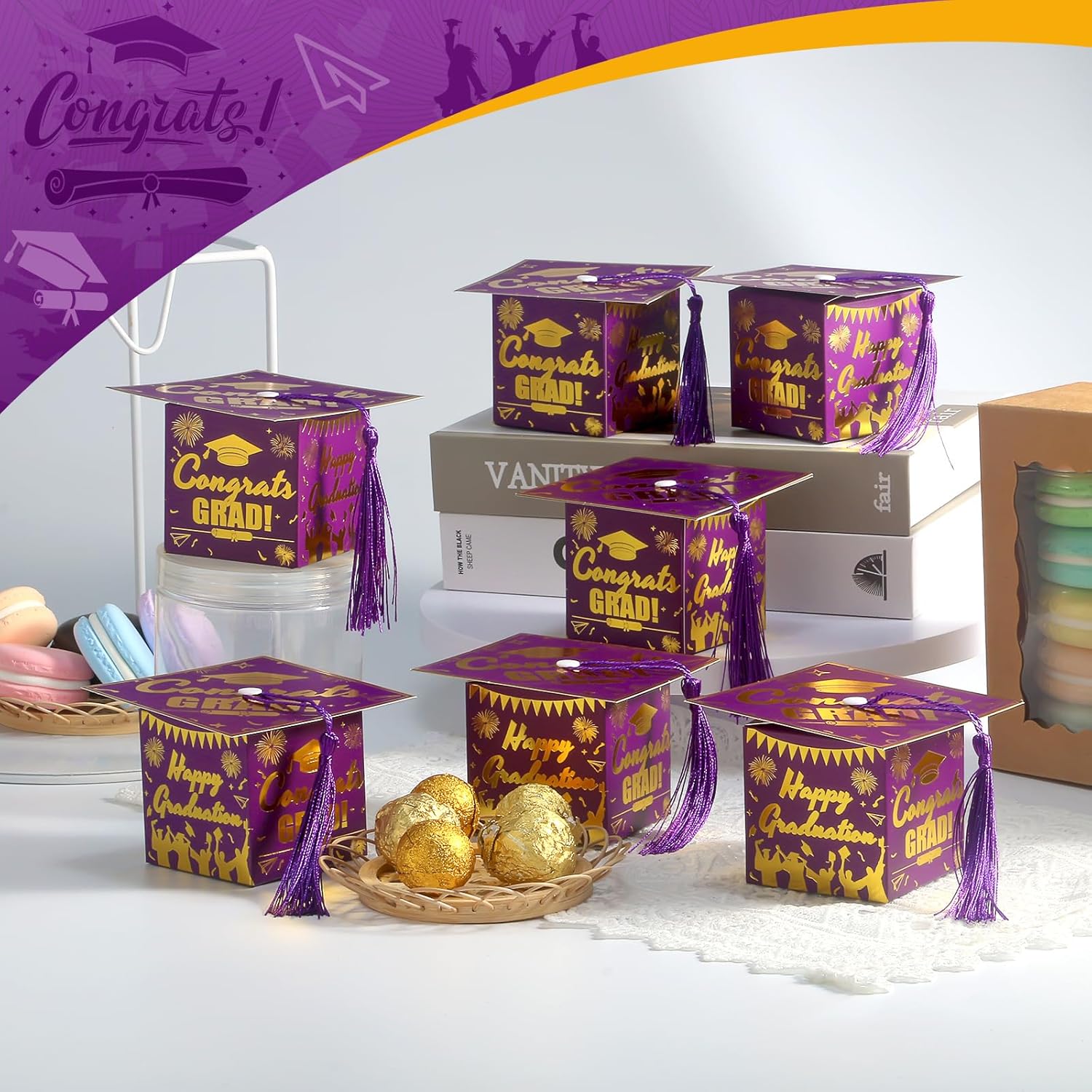 - High Quality Material: These graduation favor boxes are made of premium, food grade cardboard paper, safe, sturdy and durable enough for desserts, snacks and gifts. The purple and gold foil grad cap gift boxes are paired with purple tassels making them not just functional containers, but also charming graduation decorations for the special occasion.