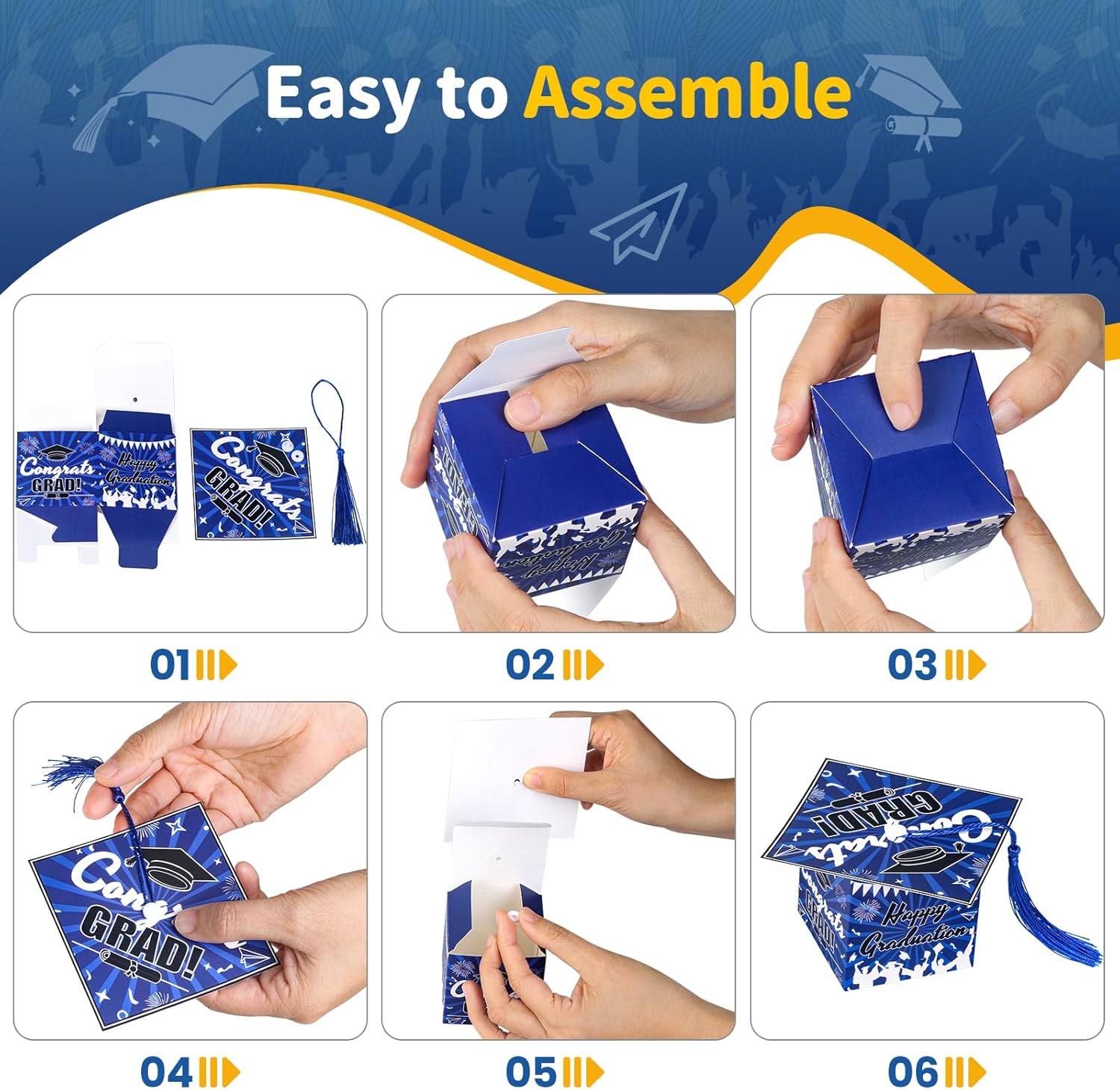 - Easy to Assemble: The graduation treat boxes are flat packed and easy to fold, saving you time and effort during your event preparation. Simply assemble them according to the crease with a few easy steps, fill it with small delectable treats or other small gifts you would like to present, making the gift-giving moment meaningful and memorable.