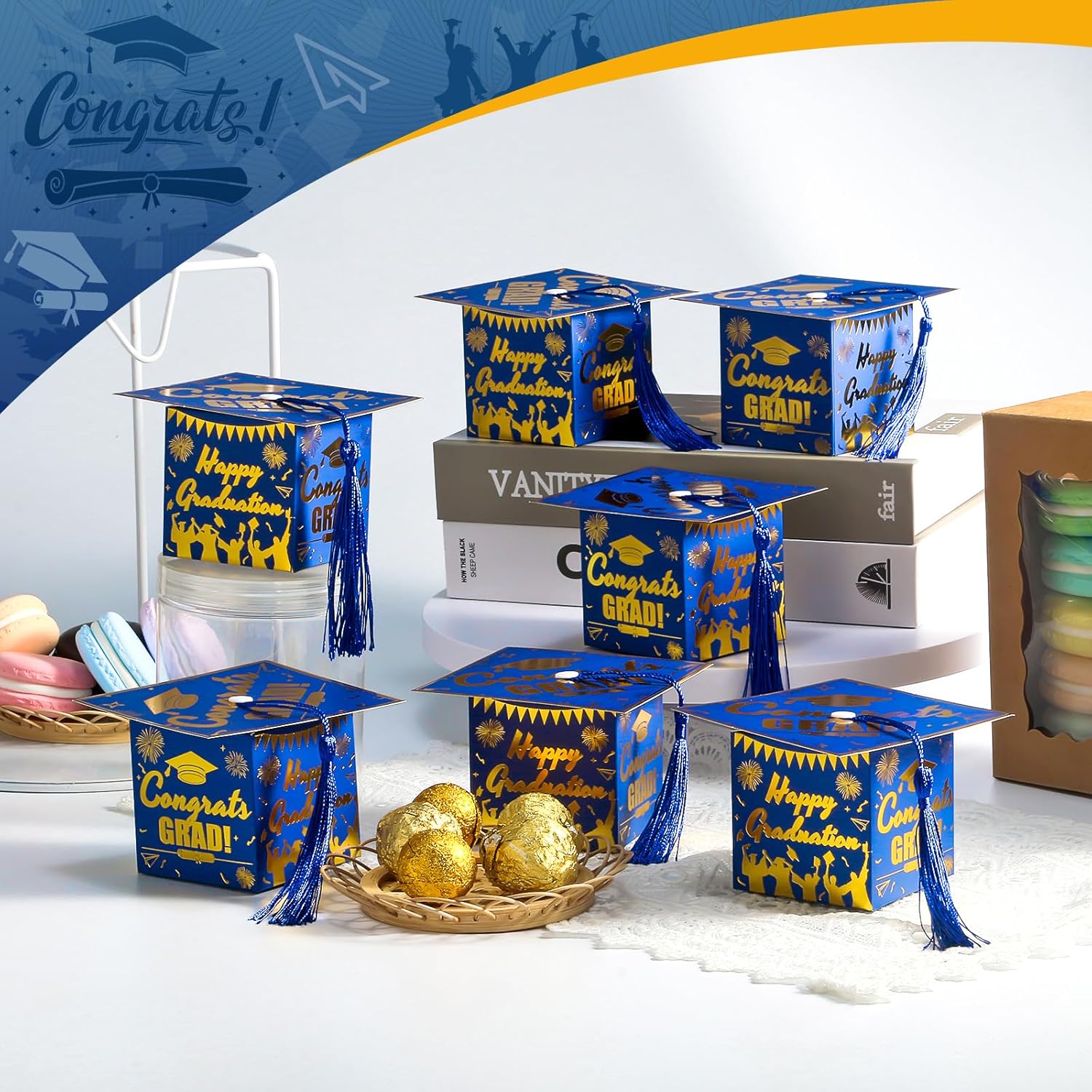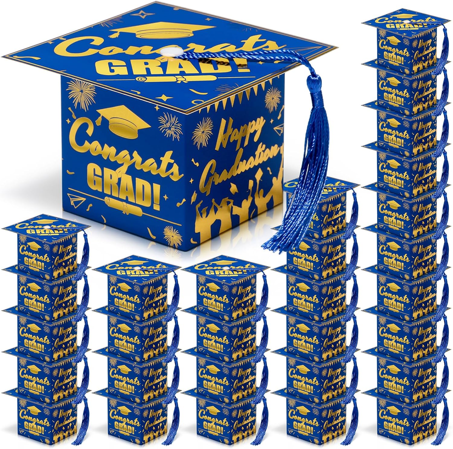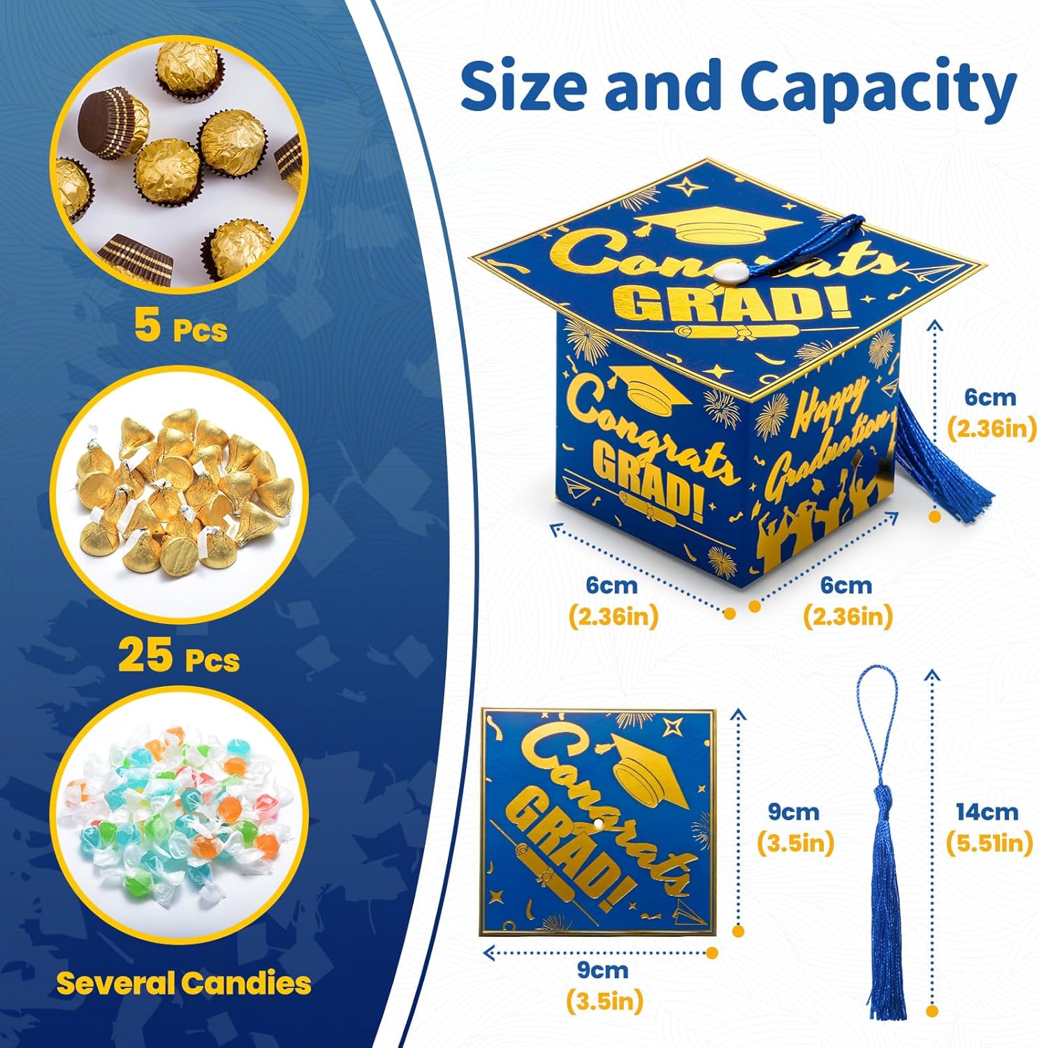 - Size: 2.36*2.36*2.36in. These portable small candy boxes are suitable for presenting a variety of treats such as candies, cookies, chocolates, or small gifts. Designed in the shape of graduation caps, adorned with classic graduation scenes elements, printed with exquisite graduation phrases, these mini gift boxes are ideal graduation party supplies.