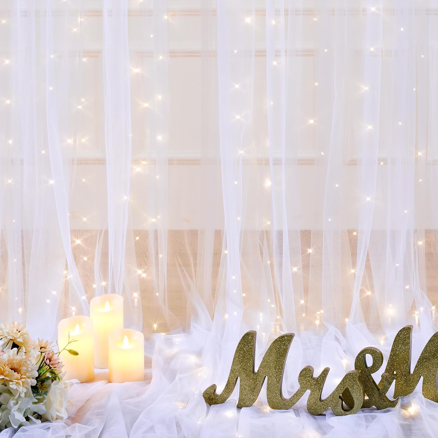 10ft x 10ft White Tulle Backdrop Curtain with Lights String for Parties Wedding Bridal Shower Sheer White Curtain Backdrop for Birthday Baby Shower Photo Booth Background Decorations