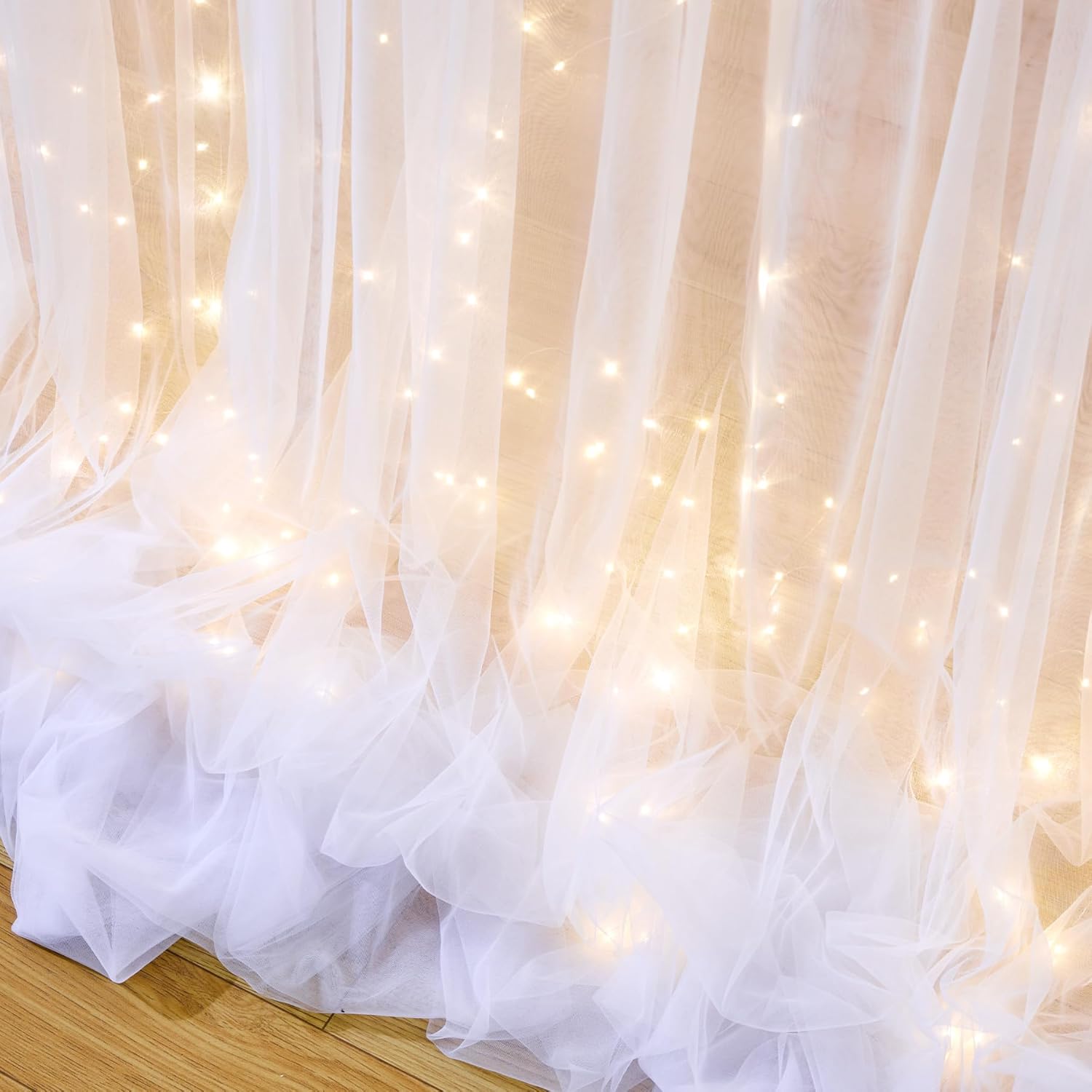White Tulle Backdrop Curtain with Lights String for Parties Wedding Bridal Shower Sheer White Curtain Backdrop for Birthday Baby Shower Photo Booth Photography Background Decorations 10ft x 8ft