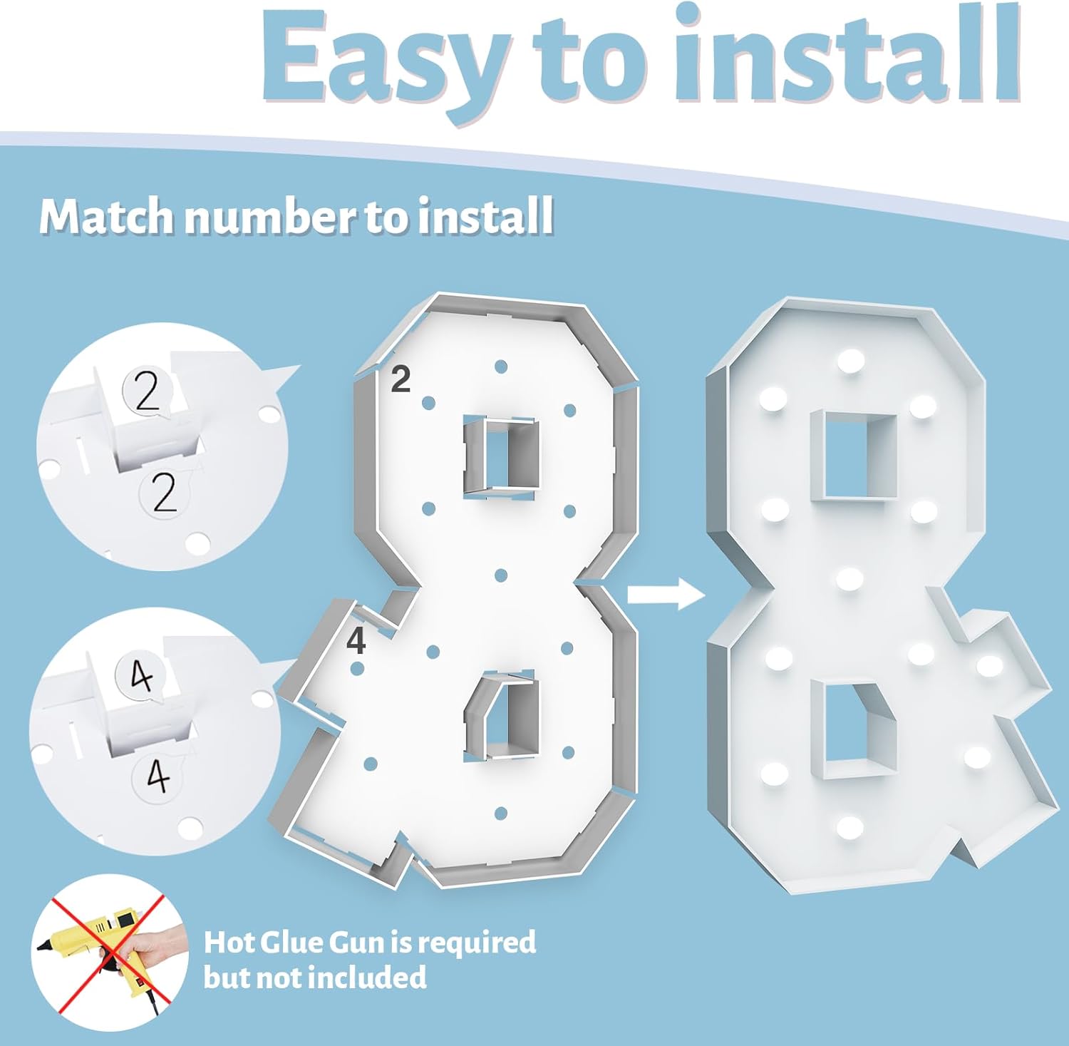 - ASSEMBLY REQUIRED: Marquee Light Up Letters consists of pre-cut frames with slots, the numerical markings in the mounting sequence will easily guide you through the matching, which requires a hot glue gun to bond and screw in the bulbs. Finish 4 feet tall checkbox letters (Note: Glue gun and batteries are not included)