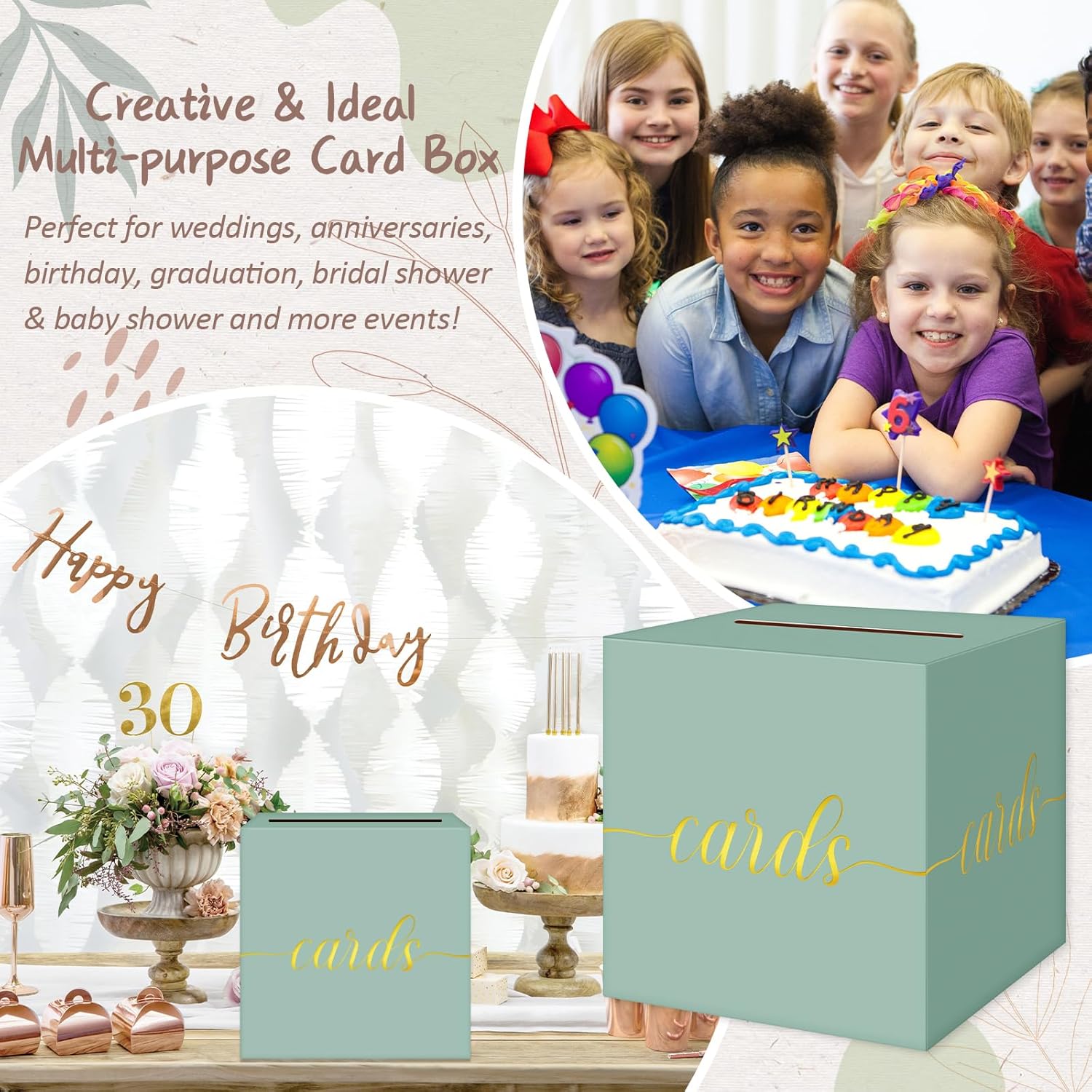 - Gold Foil Sage Green Birthday Card Box Size: Pack of 1, card box measures 8.7 x 8.7 x 8.7 inches, large size to hold all sizes of envelope cards for weddings or parties.