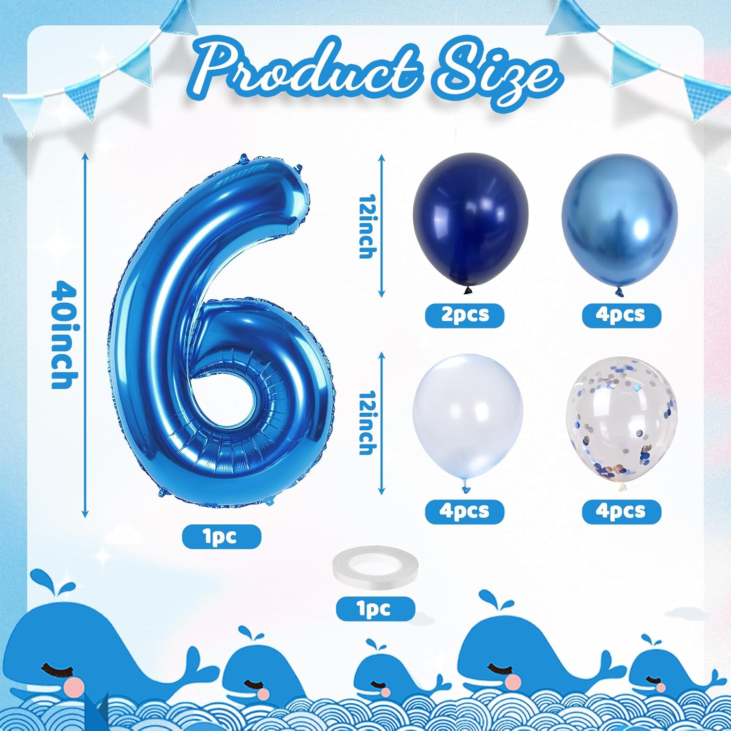- π Dark Blue Number 6 Balloon: Our package included 40 inch foil number 6 balloon(1pcs), 12 inch metallic blue balloon(4pcs), blue silver confetti balloon(4pcs), pastel blue balloon(4pcs), Light Navy Blue Balloon(2pcs), 1pcs straw and 1 roll ribbon. Simply inflate the balloon using the straw, and you're ready to party! Navy blue number foil balloons are the best for girls or boys birthday party decoration.