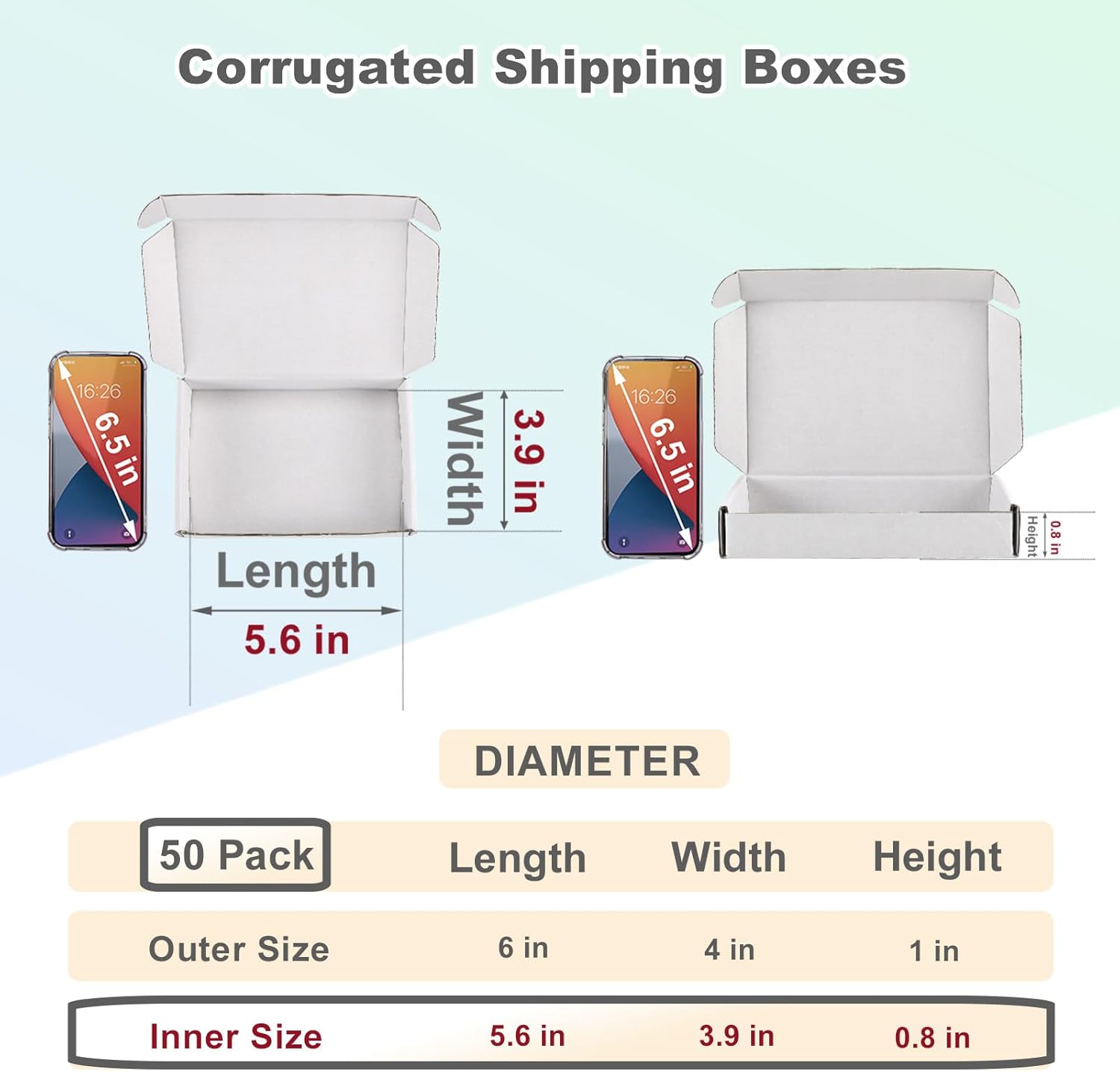 - Pack of 50: The size of white cardboard boxes is 6 x 4 x 1 boxes, and 50 mailer boxes are packaged in a carton. flat shipping flat packaging saves space and makes storage more convenient.