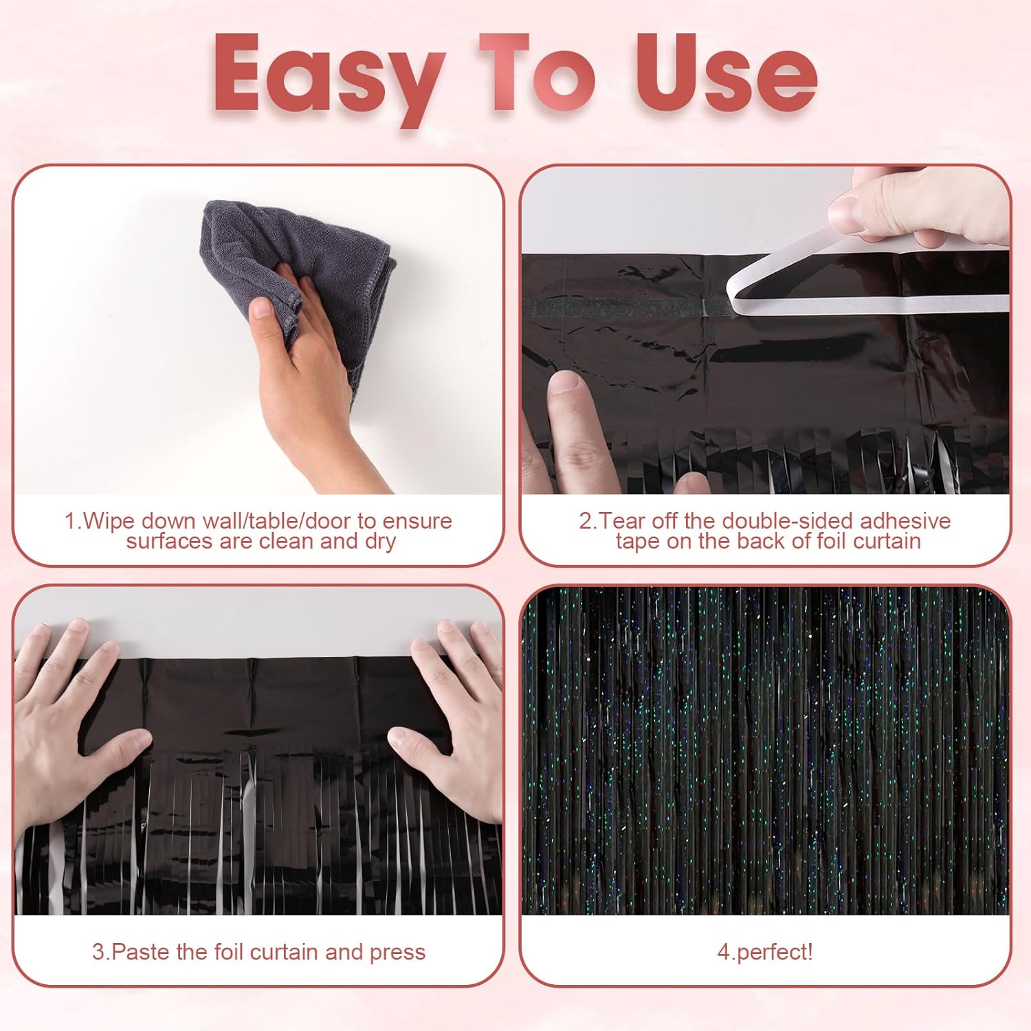 - How to Set up: Wipe down wall/table/door, ensure surfaces are clean and dry, tear off the double-sided adhesive tape, paste the foil backdrop curtains and press. Hang each individual tinsel fringe curtains in different locations for a fuller effect
