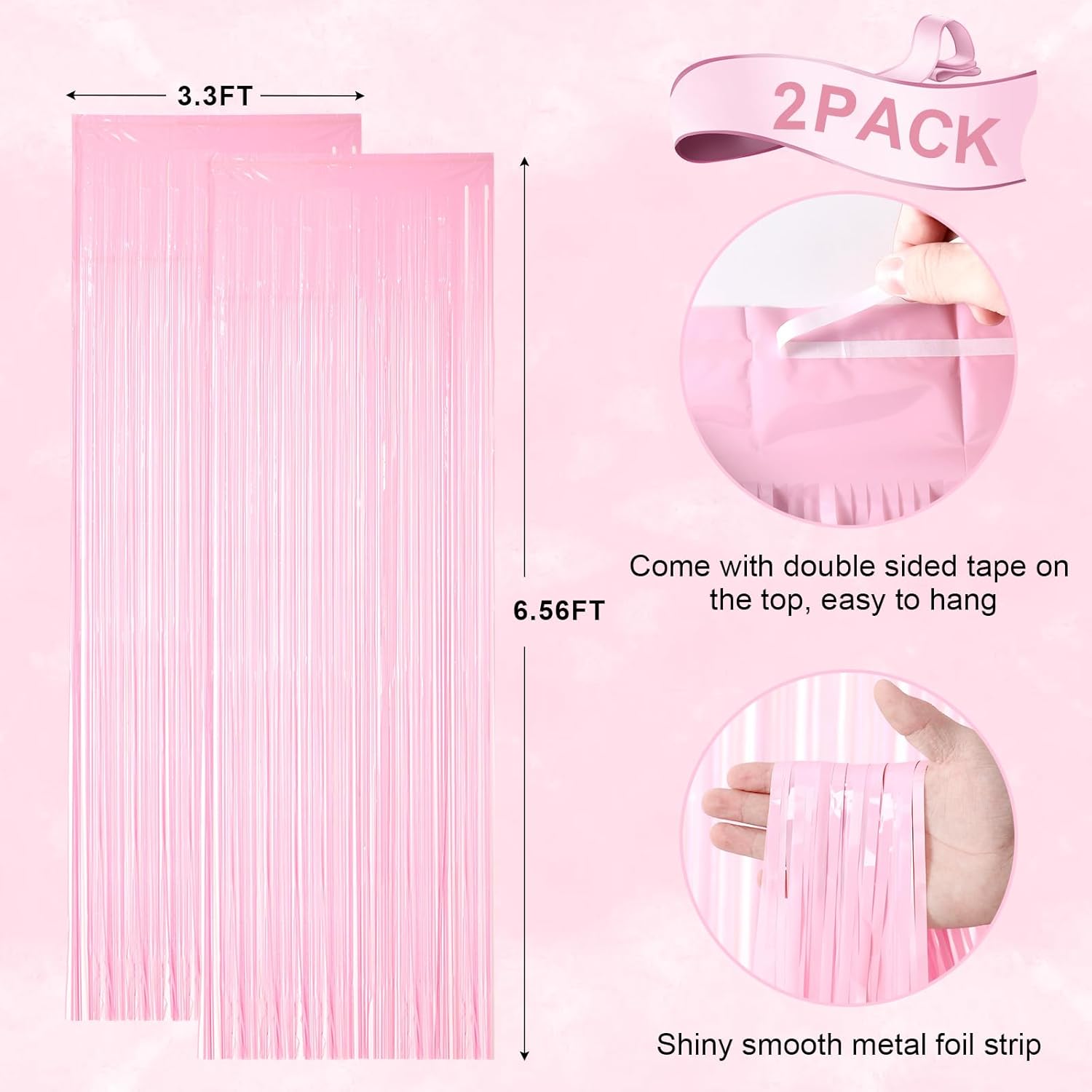 - Stunning Decorative Set: You'll receive 2 pcs pastel pink foil fringe backdrop curtains, each measuring 3.28 ft (wide)Γ6.56 ft (drop). Enough length foil fringe curtains backdrops are perfect for the door or wall to create an impressive decoration