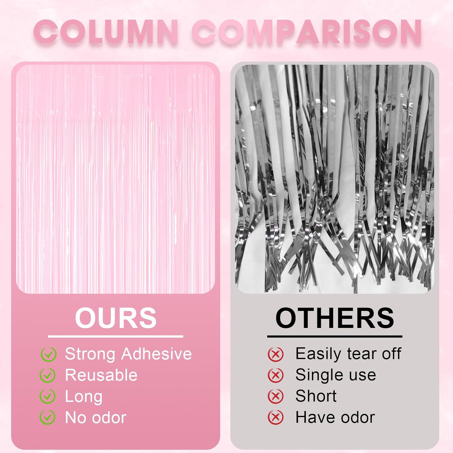 - Premium Quality: Crafted from shiny PET tinsel, these pink fringe curtains are designed to be light weight, easy to hang, and resistant to wear and tear. The metallic party streamers reflect light beautifully, creating a mesmerizing visual effect