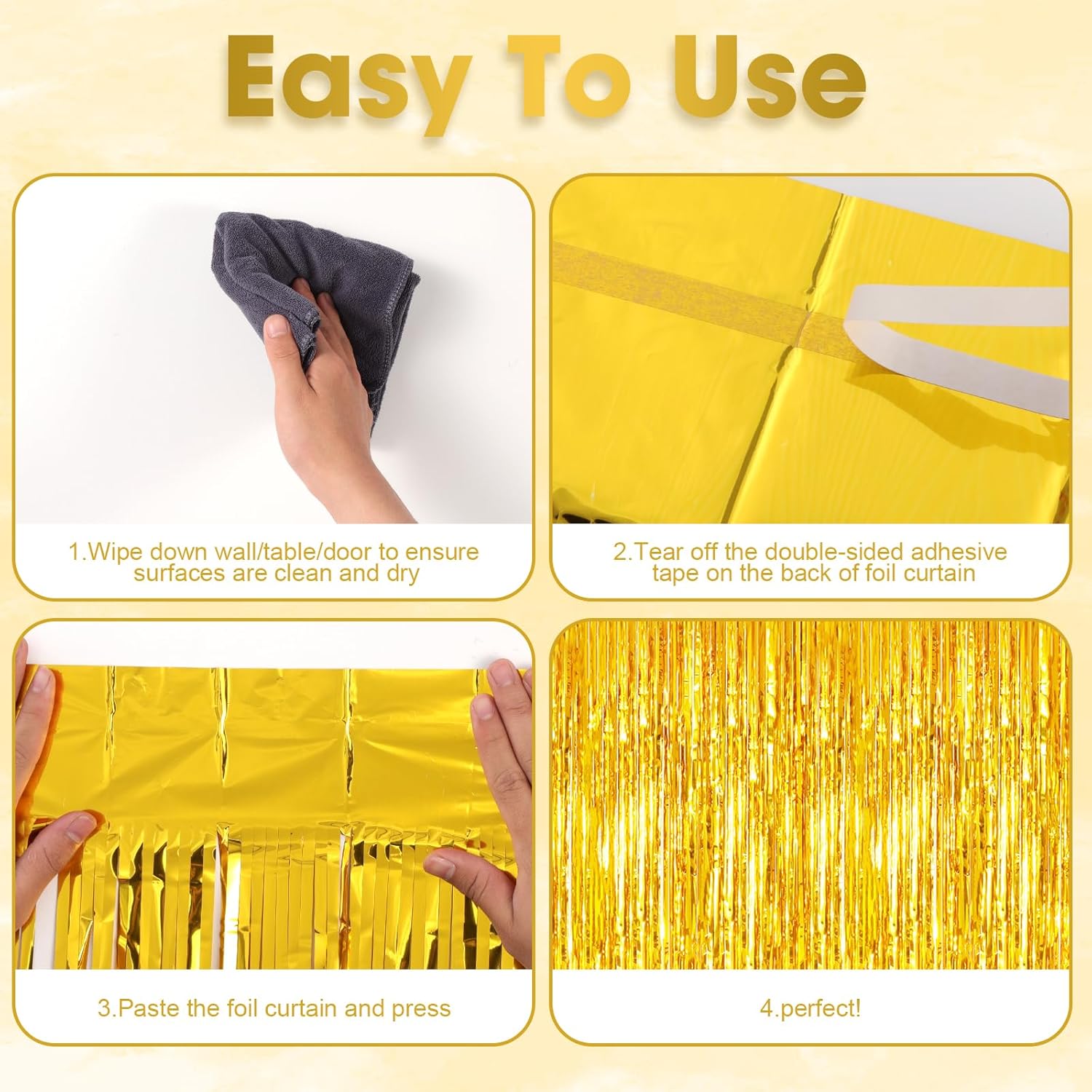 - How to Set up: Wipe down wall/table/door, ensure surfaces are clean and dry, tear off the double-sided adhesive tape, paste the foil backdrop curtains and press. Hang each individual tinsel fringe curtains in different locations for a fuller effect
