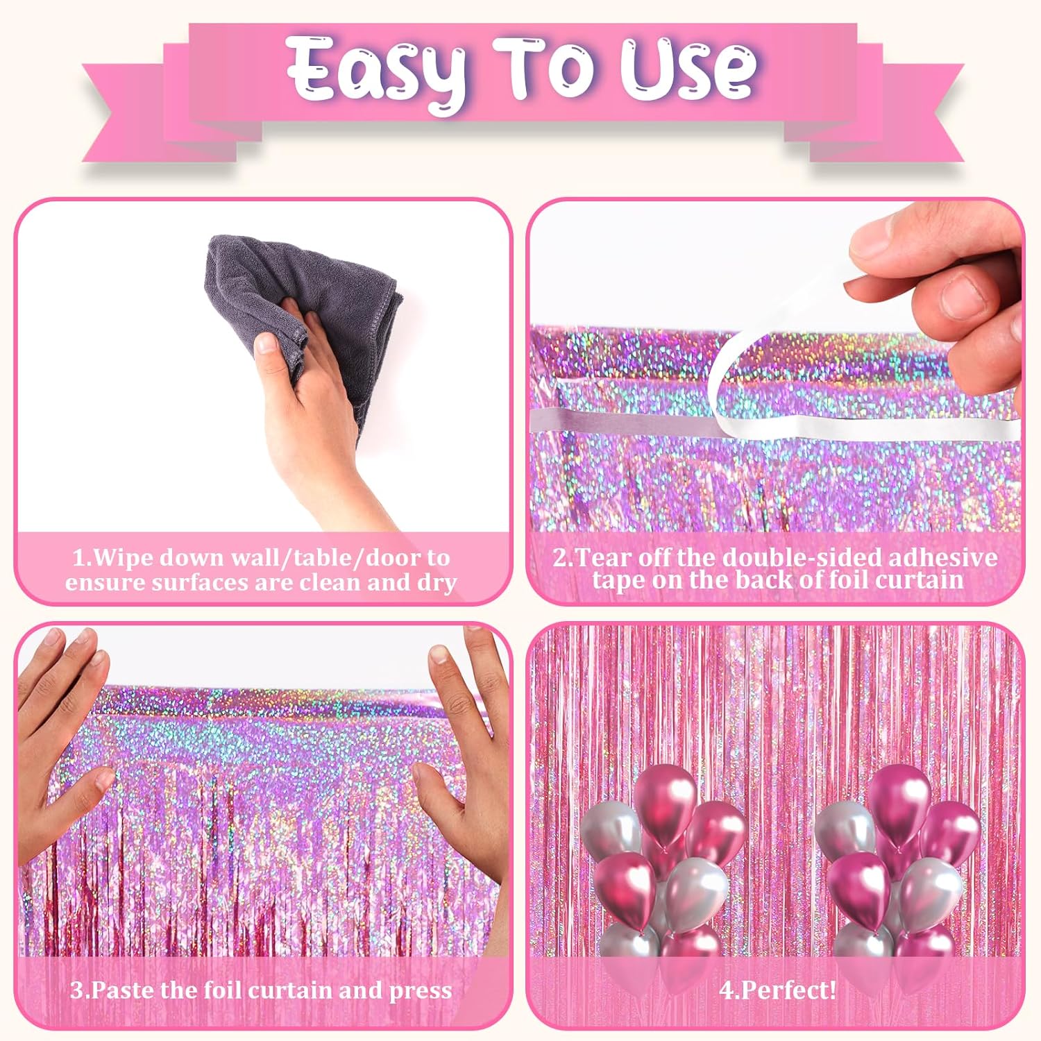 - How to Set up: Wipe down wall/table/door, ensure surfaces are clean and dry, tear off the double-sided adhesive tape, paste the foil backdrop curtains and press. Hang each individual tinsel fringe curtains in different locations for a fuller effect.