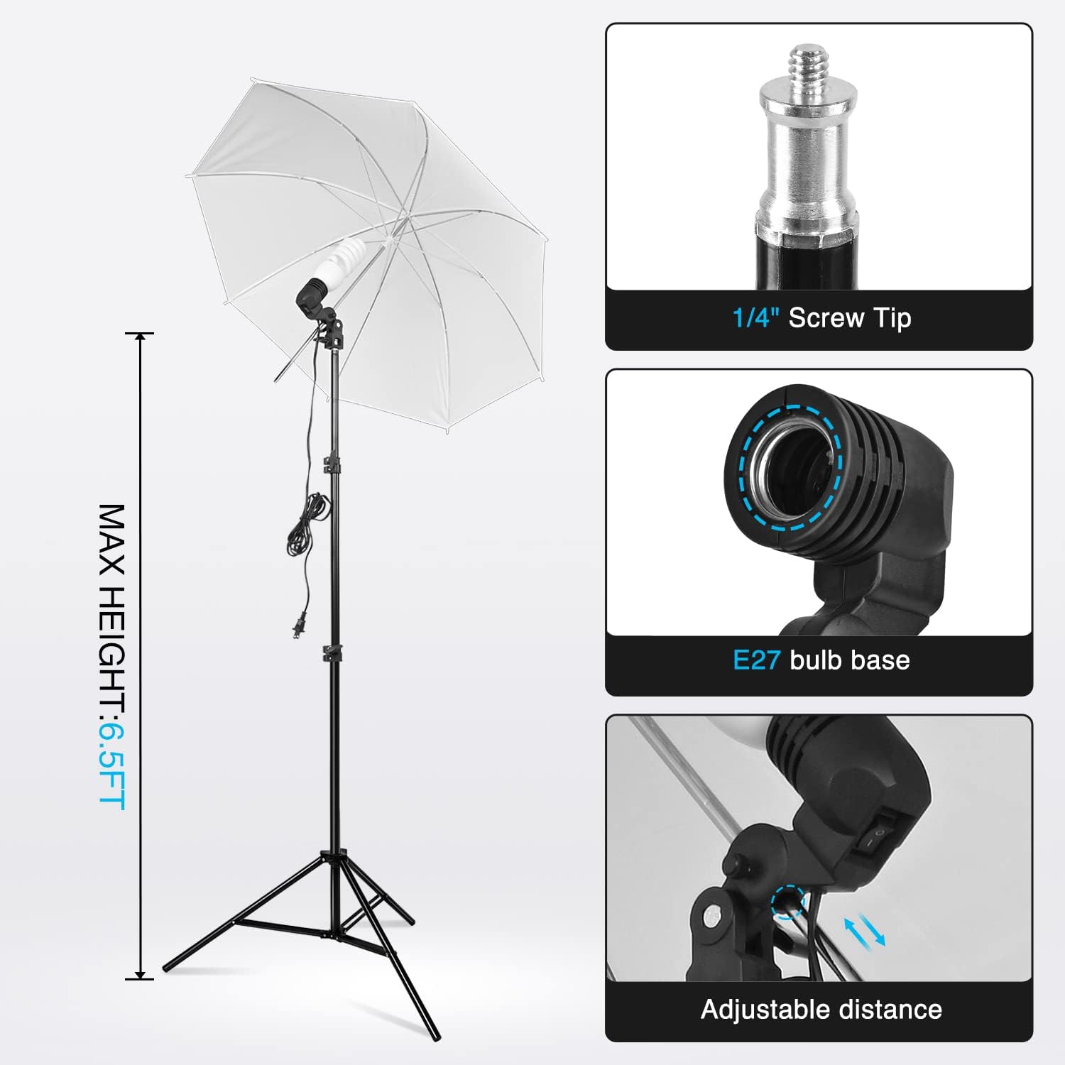 - 2X PHOTOGRAPHY UMBRELLA- 33 inch diameter lighting umbrellas diffuse light, weaken shadows, make model portrait and product shooting softer and more delicate, get ideal lighting effect by matching with common softbox or flash. The height of light stand can be adjusted between 26inch-79inch. manually adjust distance between light bulbs & umbrella to get best light.