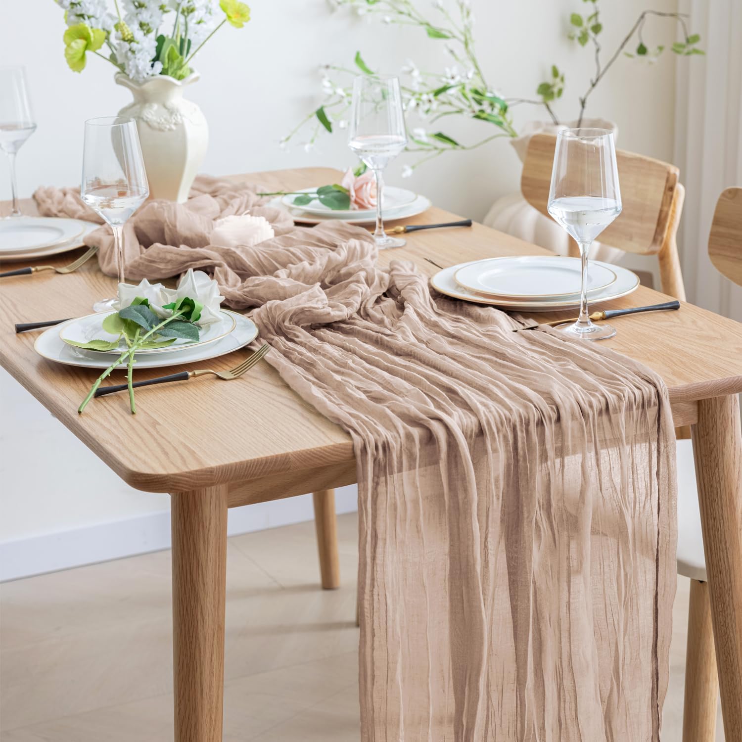 - 【Cheesecloth Table Runner】 Size: 35" W x 120" L. You will get 3 pieces 10FT length cheesecloth table runner. The sheer rustic table runner is long enough to span a large table and drape gracefully across the table. It will gently sway in the wind, adding a romantic atmosphere to your occasion. These eye-catching gauze table runners are ideal for arranging an elegant, stylish tablescape.