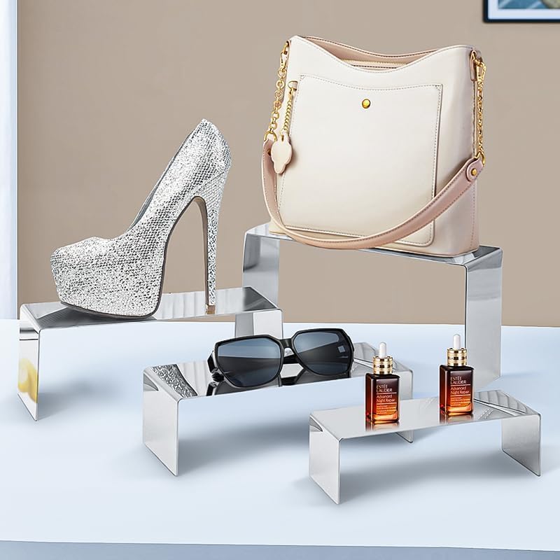 4 Pcs Silver Stainless Steel Display Risers, Display Stand for Display Cupcake Dessert Perfume Purse Handbag Shoe Jewelry and Funko Pop