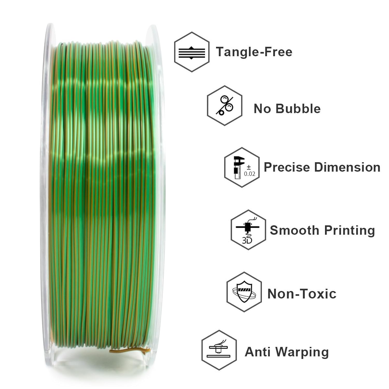 - 【High Compatibility】This Silk Dichromatic Filament are universally designed and compatible with 3D Printers using 1.75mm diameter filament, with a dimensional accuracy of +/- 0.02mm