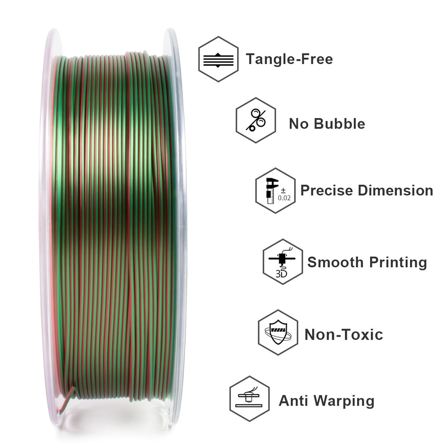 - 【High Compatibility】This Silk Dichromatic Filament are universally designed and compatible with 3D Printers using 1.75mm diameter filament, with a dimensional accuracy of +/- 0.02mm