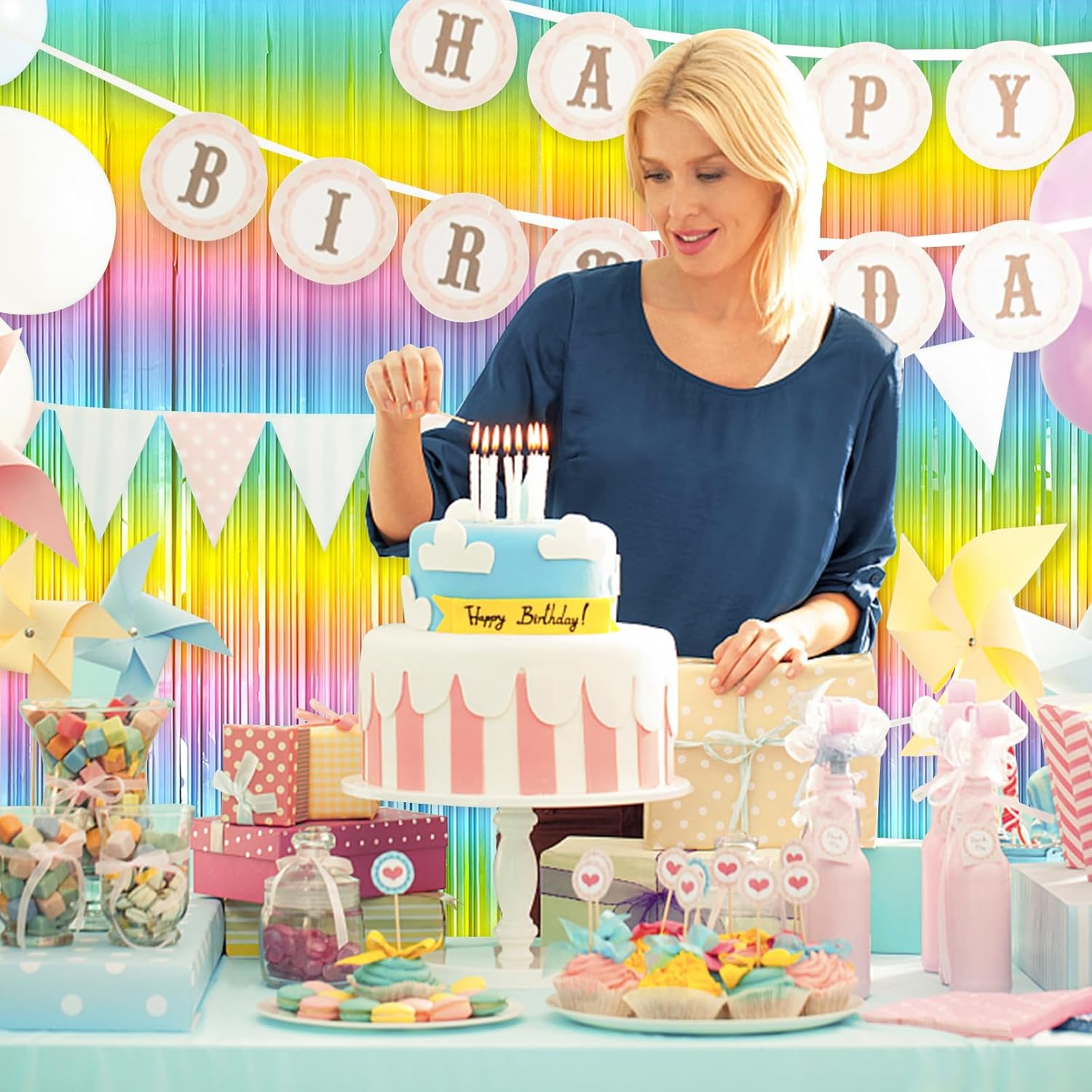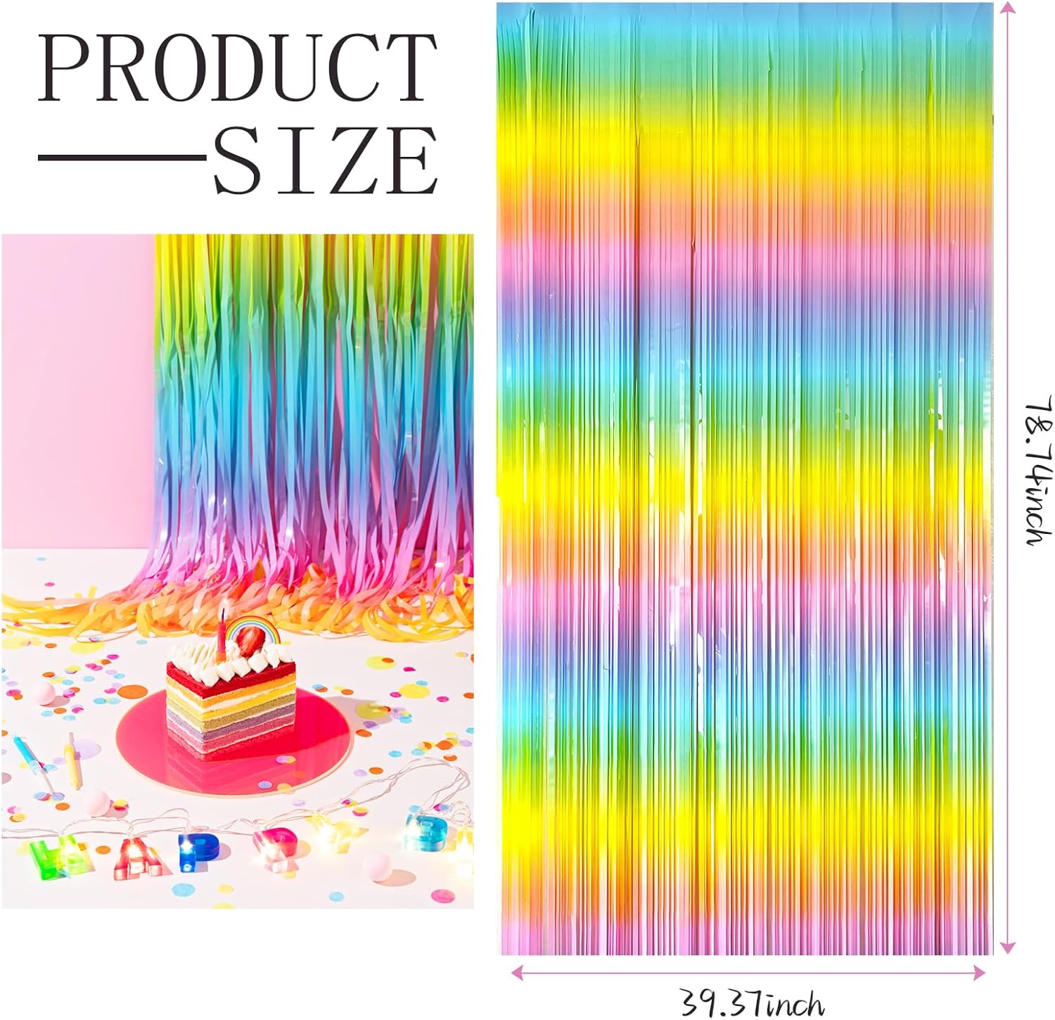 - Rainbow Birthday Decorations:3 packs rainbow streamers, the size of the foil curtain is 3.28 ft x 6.56 ft.It's long enough to fit any occasion. Please do not stick the foil curtain on uneven or stained walls to prevent it from falling off.