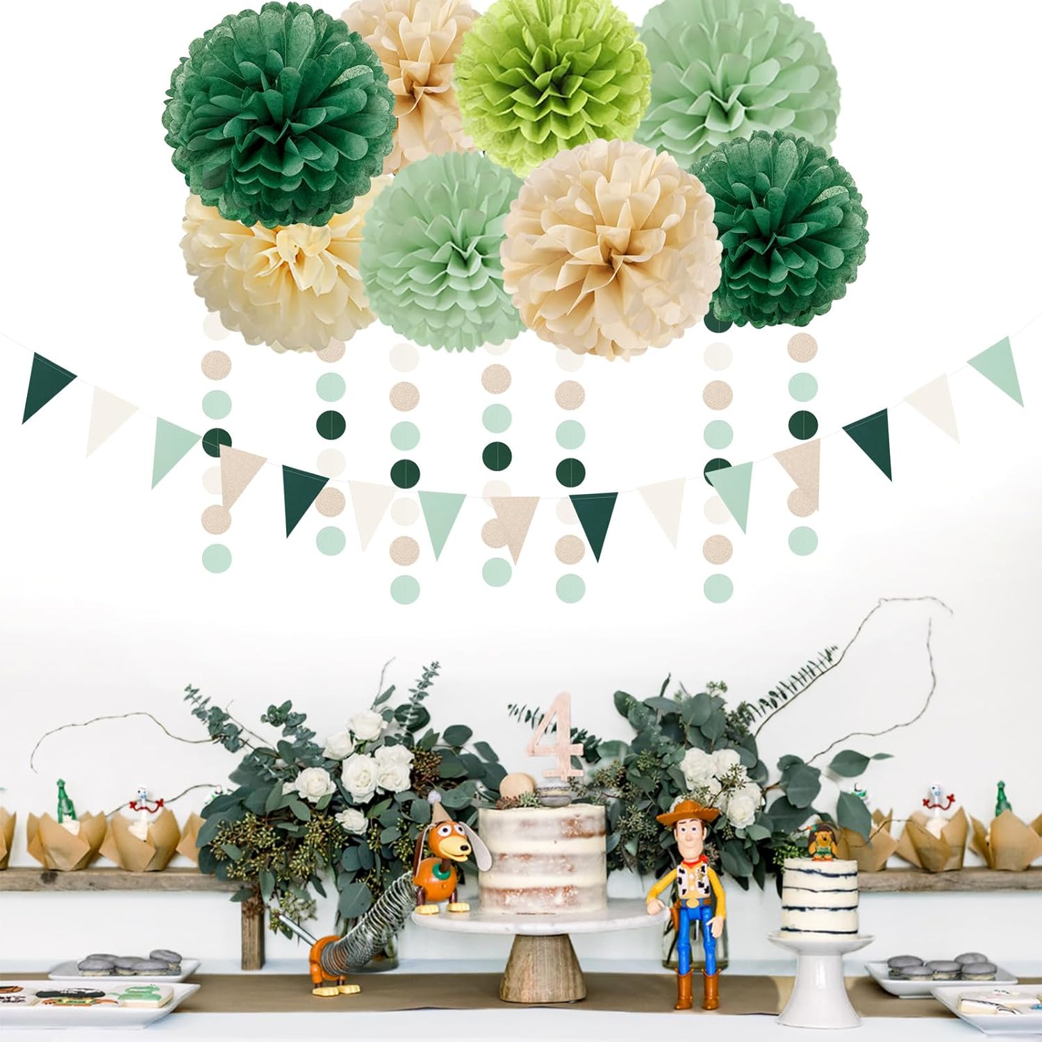 - 【Sage-Olive Green Champagne-Gold Party Kits】The party decorations kits include 8pcs tissue paper flowers: 4pcs 8" and 4pcs 10" in sage green,olive green,champagne color, 1pcs Triangle Flags,1pcs circle dots paper garland,20pcs tassel garland. Total30pcs.