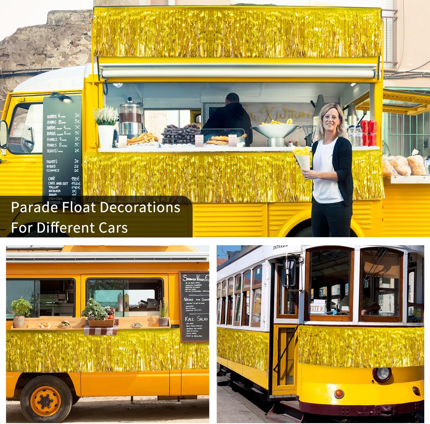- You'll get: Metallic streamers party decorations includes 4 metallic gold tinsel fringe garland and 40 capsules Glue Dots. Each gold streamers are 12ft, providing ample length for gold party decorations. Ideal for parade float decorations for trailer.