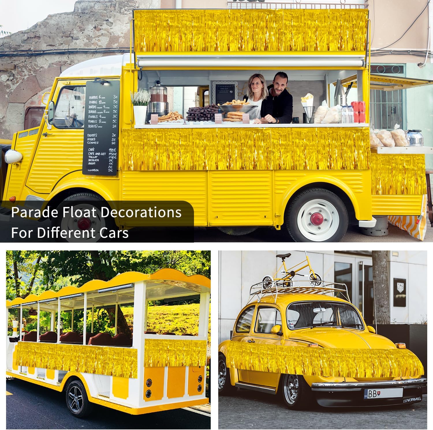 - You'll get: Metallic streamers party decorations includes 4 metallic gold tinsel fringe garland and 40 capsules Glue Dots. Each gold streamers are 12ft, providing ample length for gold party decorations. Ideal for parade float decorations for trailer.
