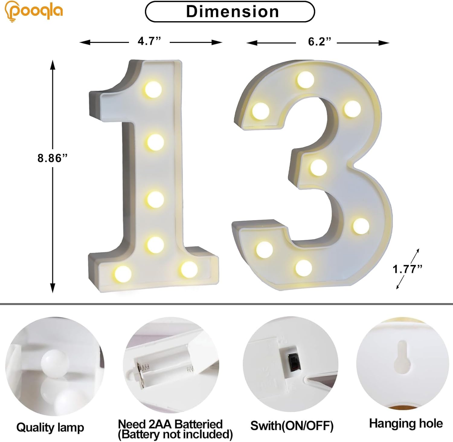 - DIY Free Mix: Our marquee number lights will show their worth in any themed party, adding the finishing touches you need to make it an unforgettable memory. For example, you can combine light signs to make "13" to celebrate a girl's birthday, or "50" to celebrate a golden wedding anniversary, and so on. Use your excellent creativity and great imagination to use light up numbers flexibly!