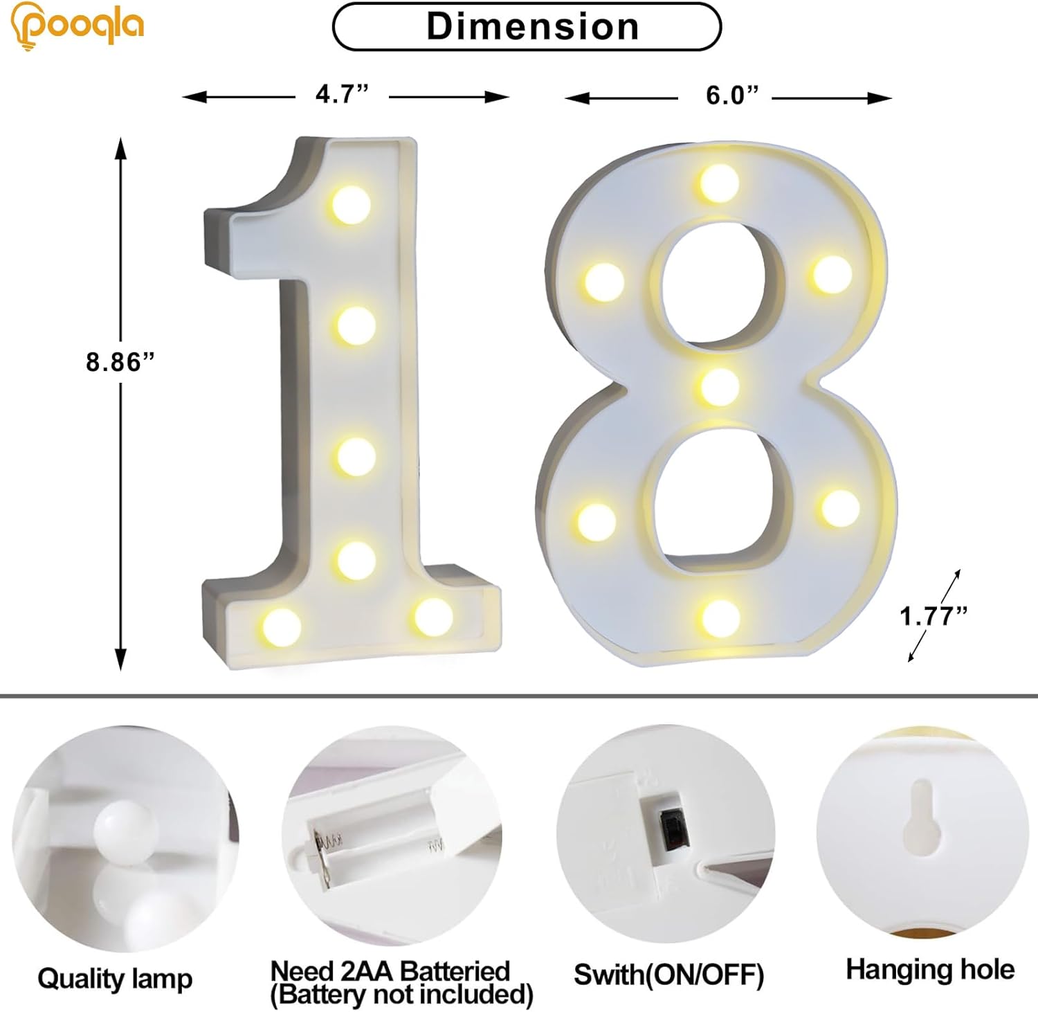 - Combination of Two Numbers: You'll receive two lovely light up numbers, respectively in the numbers [1] and [8]. Their glossy white color and smooth appearance will make you love these sweet number lights as soon as you receive the package and open it. We believe battery powered marquee numbers will surely provide you with a wonderful party decoration experience.