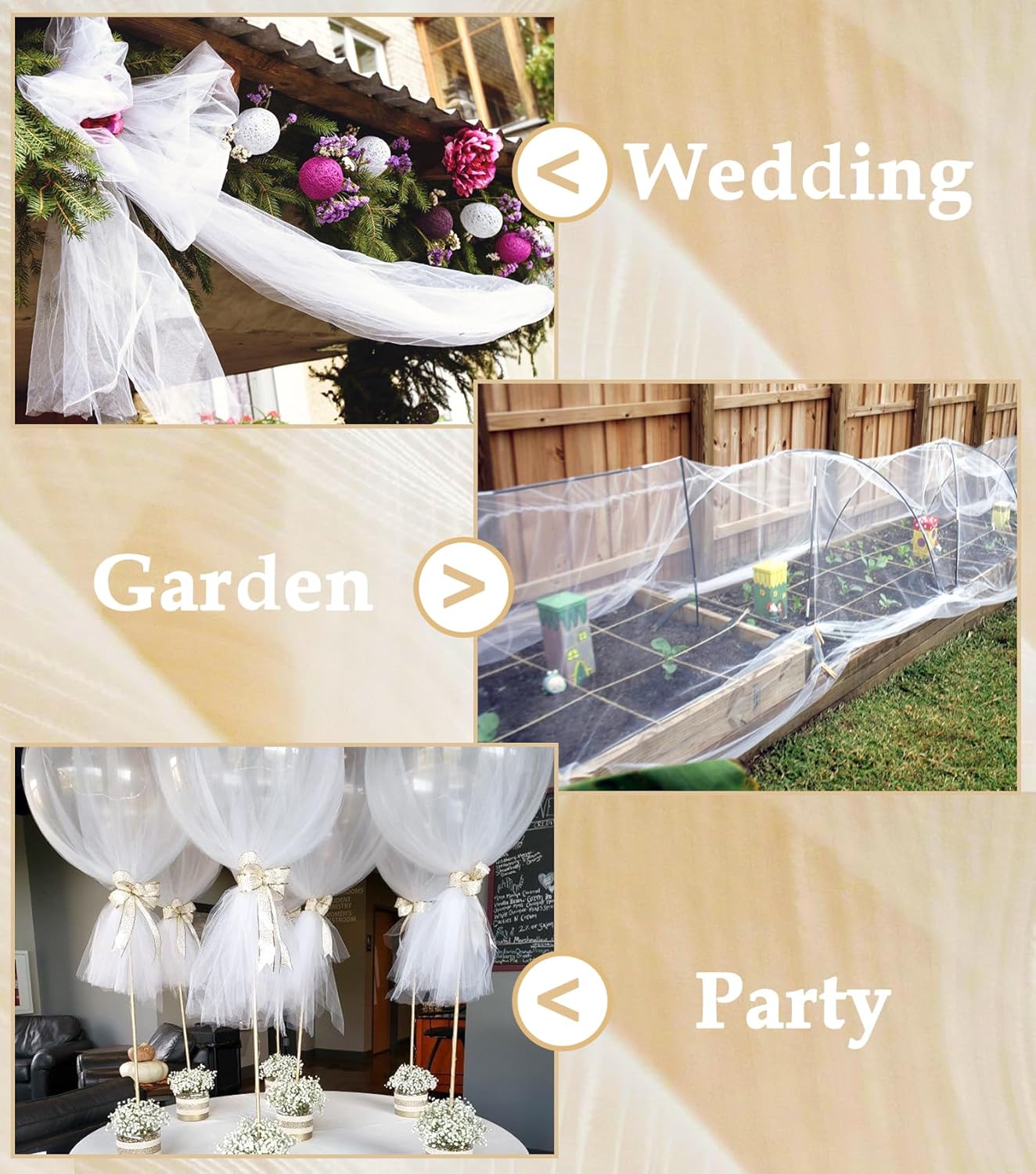 - Romantic & Practical - 108 inches tulle can be perfectly used for wedding, birthday party, bride shower, baby shower, Christmas and other activities. It can also be used in garden, farm and other daily purposes to prevent pests.