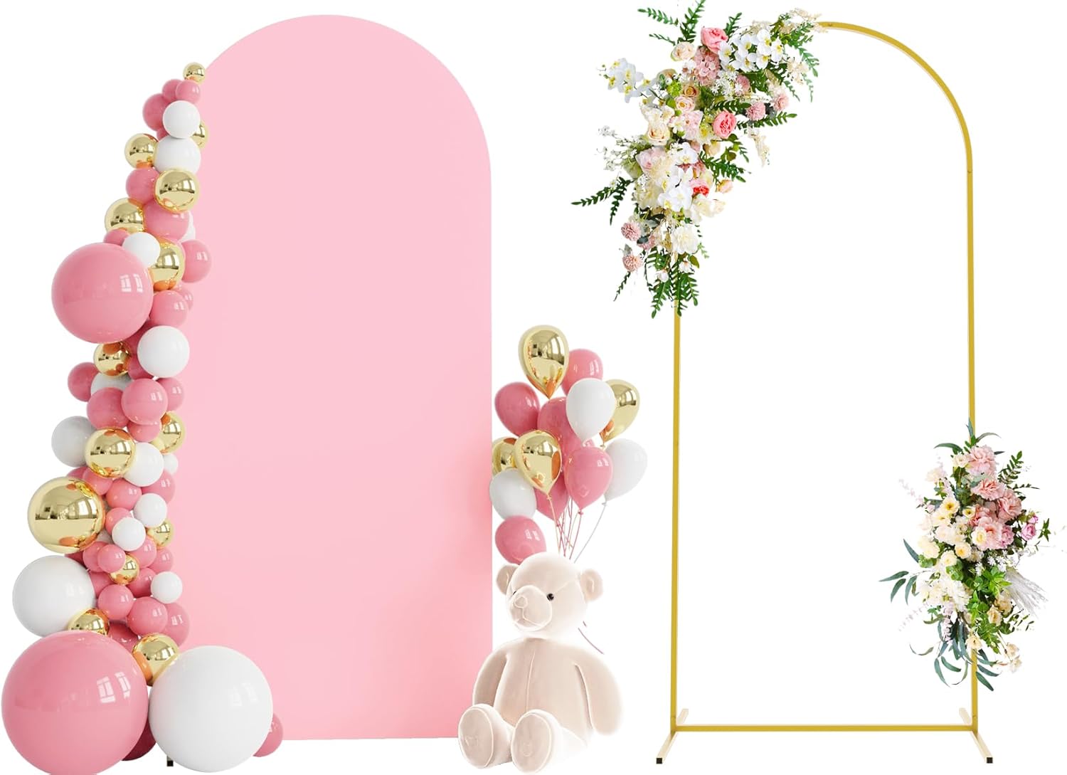 - 【Arch Stand and Covers Package】Package contains 1pcs wedding arch stand and 1pcs arch cover. Size: 6x2.6ft(HxW). Material: metal arch backdrop stand and spandex arch cover. Color: Pink arch cover and gold wedding arch stand. Decorate your party with our gold arch stand and arch covers to create an epic decor for your celebration.
