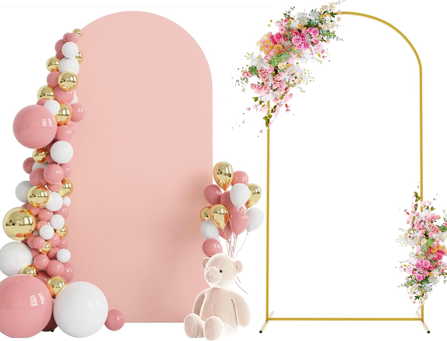 - 【Arch Stand and Covers Package】Package contains 1pcs wedding arch stand and 1pcs arch cover. Size: 6.6x3.3ft(HxW). Material: metal arch backdrop stand and spandex arch cover. Color: Pale Pink arch cover and gold wedding arch stand. Decorate your party with our gold arch stand and arch covers to create an epic decor for your celebration.