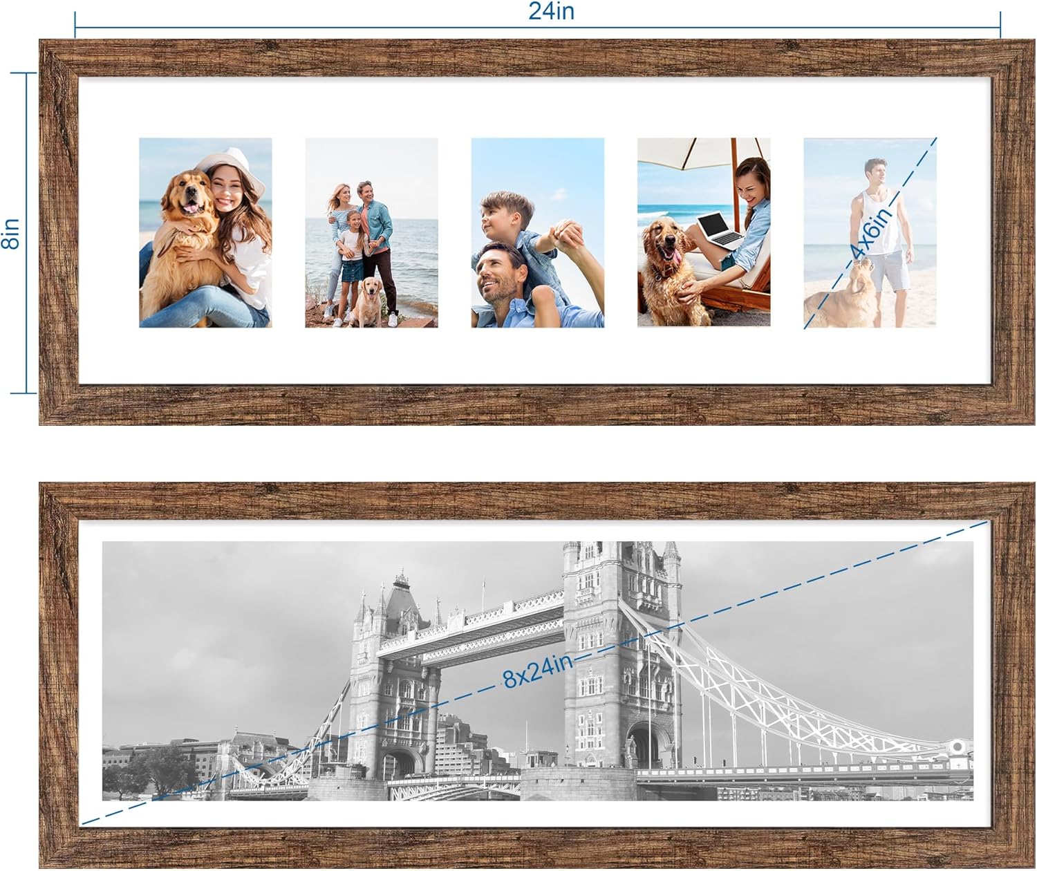 8x24 Picture Frame 2 Pack, Rustic Brown Wood Frame with Tempered Glass, Display Pictures Multiple Five 4x6 With Mat or 8 x 24 Without Mat - Horizontal or Vertical Wall Mounting