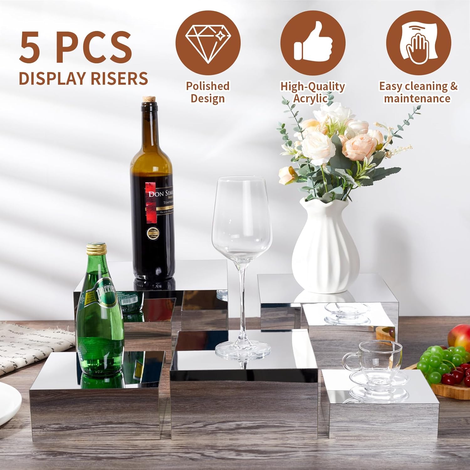 Acrylic Risers for Display 5 Pcs, Food Risers for Party Silver Acrylic Risers Display Stands Acrylic Box Nesting Display Risers for Jewelry Bag Cosmetics Catering Dessert Collectibles