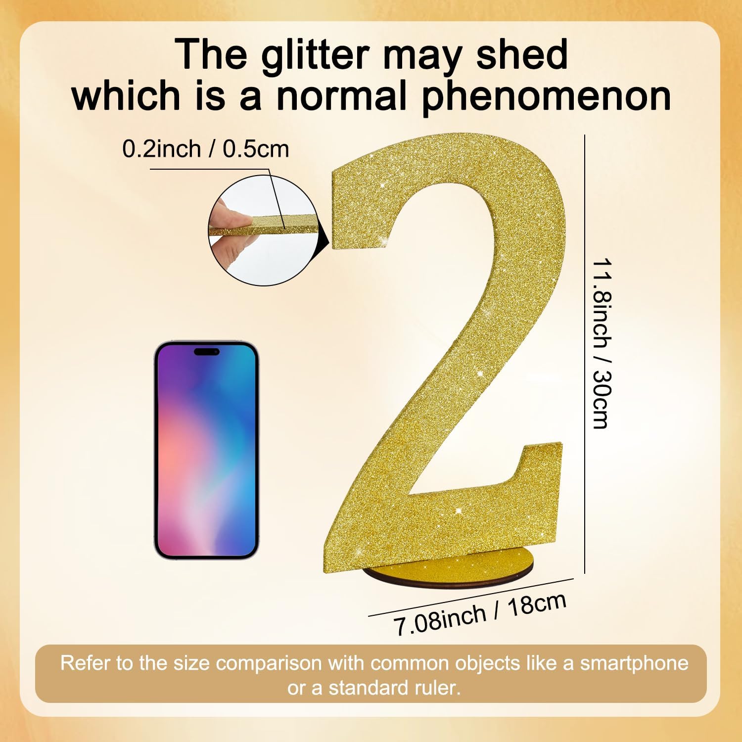 - Item Information: 1*2 gold glitter number ornament. Size: 30*20*0.3 CM (11.8 * 7.9 * 0.12 Inch)