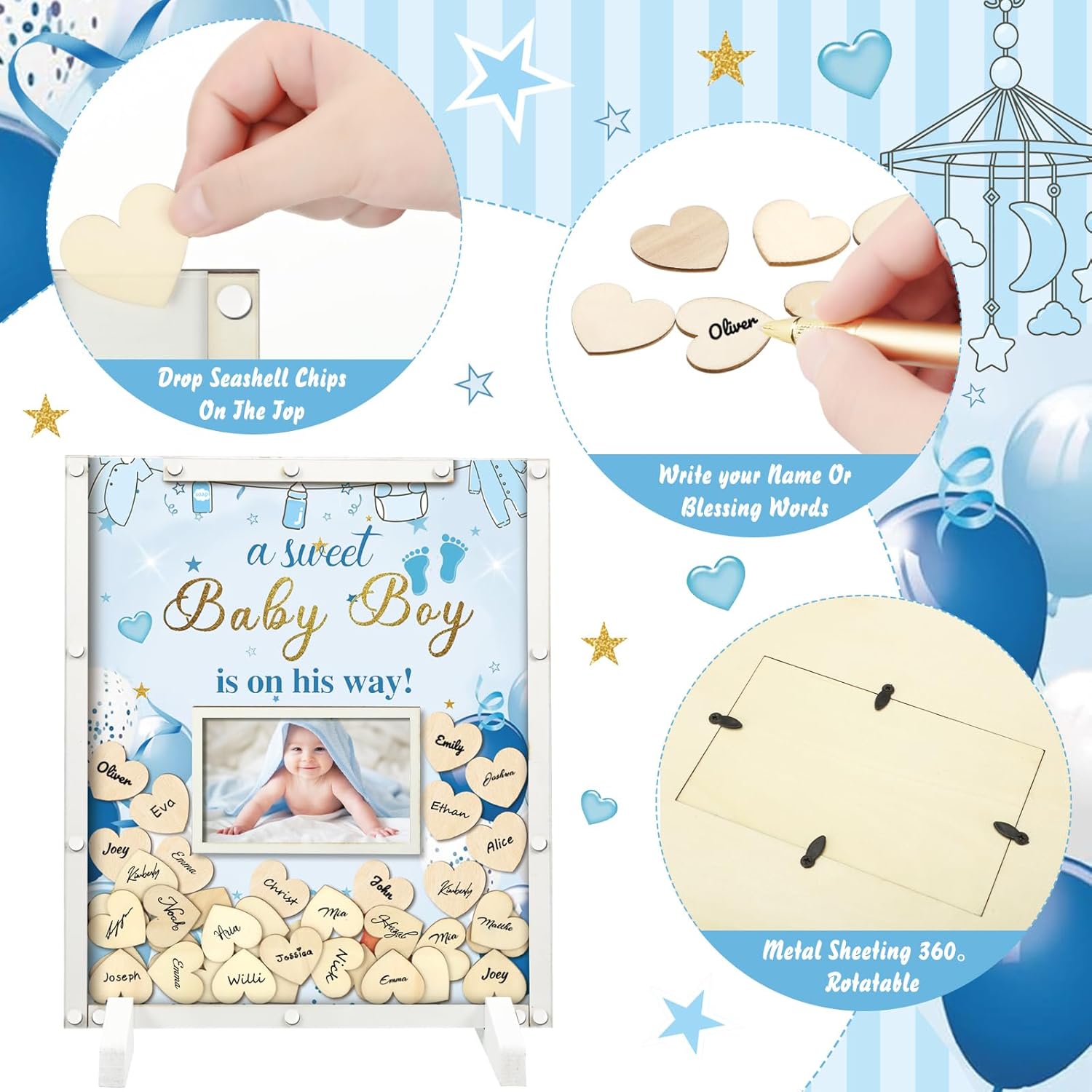 65 Pcs Blue Baby Shower Guest Book Alternatives He or She Gender Reveal Baby Shower Decorations Sign in Guest Book with Picture Frame and 60 Wooden Chip