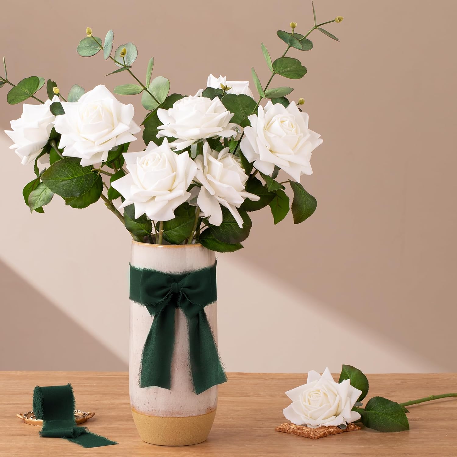 DORIS HOME 2" x21Yd Chiffon Ribbon for Flower Bouquet, Green & Cream Fabric Ribbon for Gift Wrapping, Handmade Frayed Ribbon for Wedding/Christmas Decorations