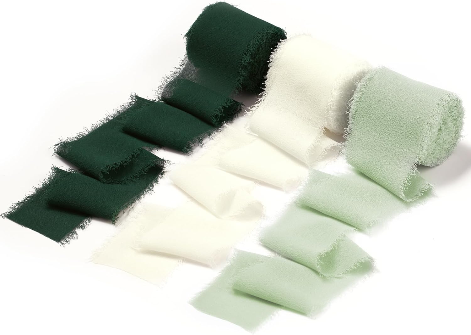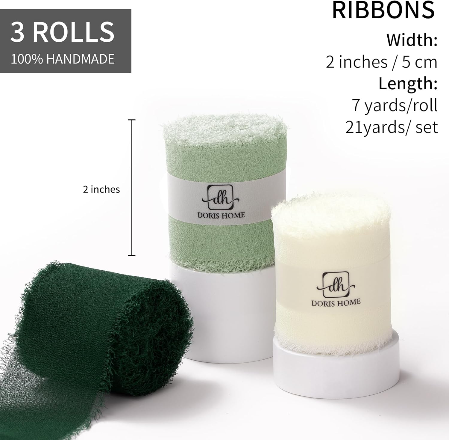 - 【Size and Color】Each roll of chiffon ribbon is 2 inches wide and 7 yards long, perfect for various creative uses such as making bows, decorating wreaths, and DIY crafts. This set includes dark green, sage green, and cream ribbons, one roll each. These vibrant frayed ribbons add a rustic charm to your creations, ideal for bouquet wrap or gift ribbon.