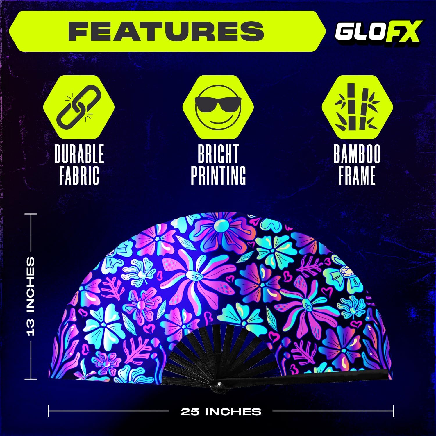 - VIBRANT UV GLOW DESIGN: Stand out at any rave or festival with our GloFX UV Glow Flower Fantasy Rave Fan. Its vibrant pink, blue, and purple design comes to life under UV or black light, ensuring you're the center of attention wherever you go.