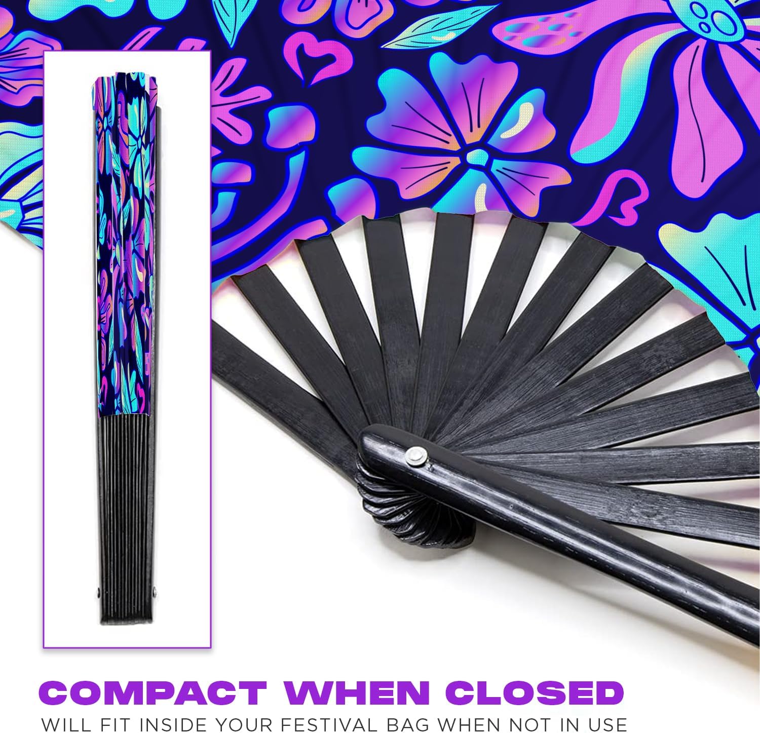 GloFX UV Glow Flower Fantasy Rave Fan - Vibrant Pink, Blue, and Purple Design - Large Folding Hand Held Fan for Festival Fashion & Festival Outfits for Women