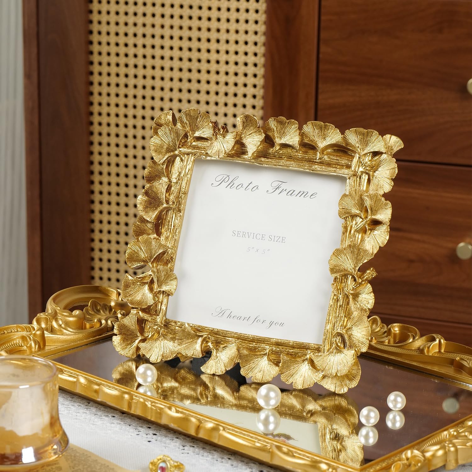Cuspin Vintage Gold 5x5 Picture Frame, Gold Ornate Leaf Textured Hand-Crafted Resin with Glass Front, Antique Square Photo Frame for Tabletop Display, Retro Design Home Decor
