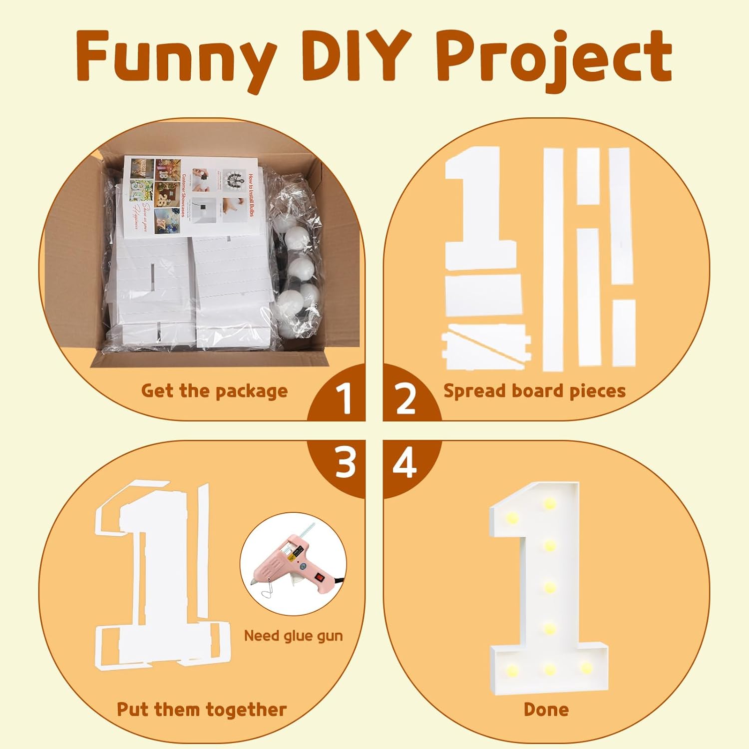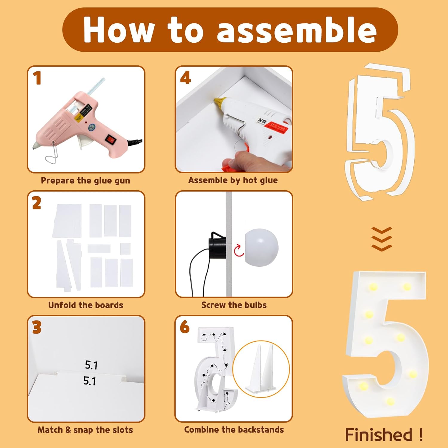 - Package Includes: A set of light up numbers for party containing the pre-cut letter frames, a light string with several bulbs and assemble guiding manual. ( Noted: Glue gun and batteries are not included