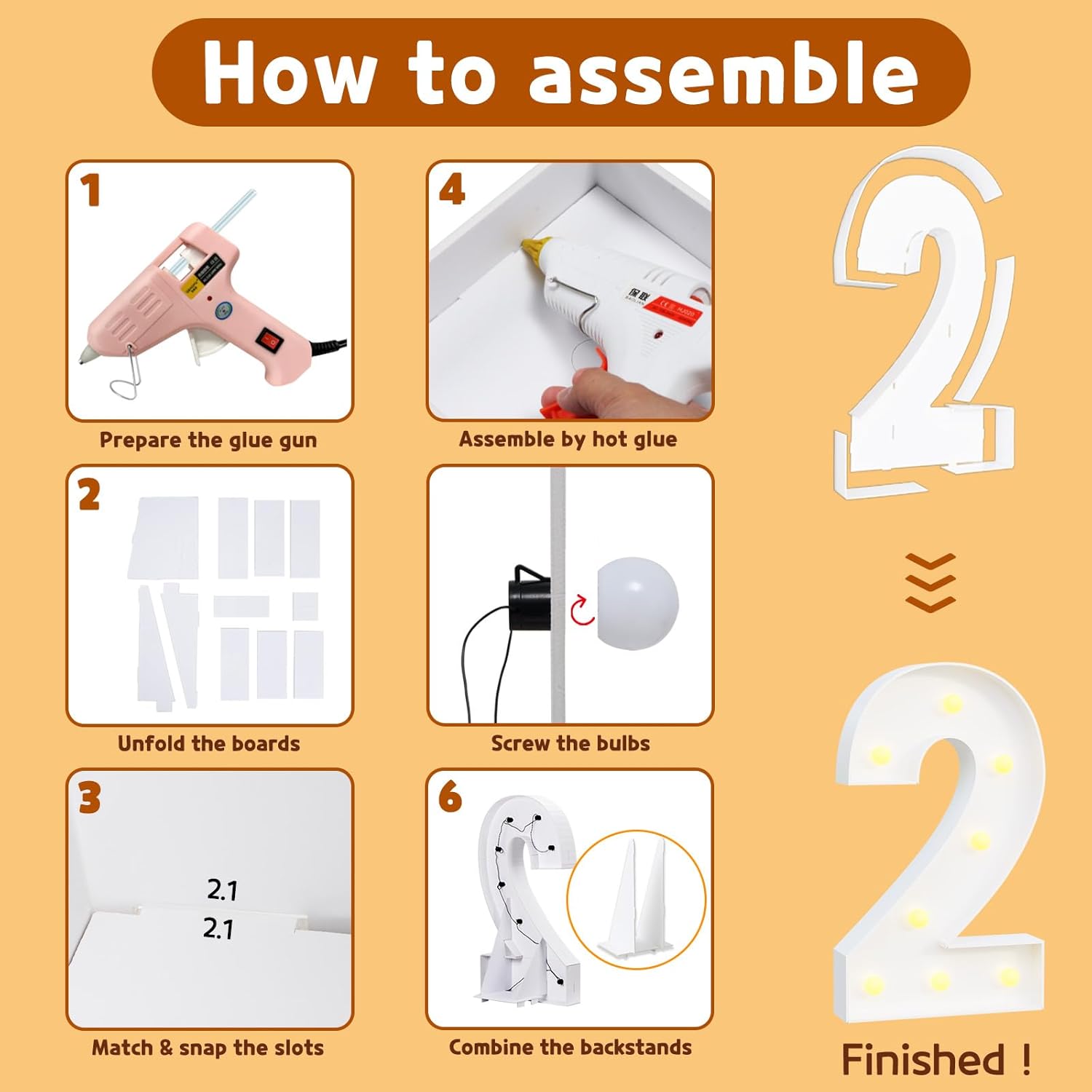 - Package Includes: A set of light up numbers for party containing the pre-cut letter frames, a light string with several bulbs and assemble guiding manual. ( Noted: Glue gun and batteries are not included
